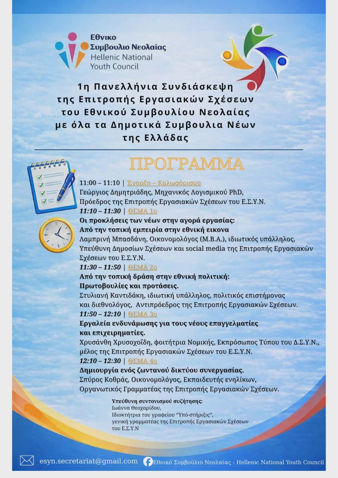 Με επιτυχία πραγματοποιήθηκε η 1η Πανελλήνια Συνδιάσκεψη της Επιτροπής Εργασιακών Σχέσεων του Εθνικού Συμβουλίου Νεολαίας (ΕΣΥΝ), με τη συμμετοχή Δημοτικών Συμβουλίων Νέων από όλη τη χώρα, σε υβριδική μορφή.