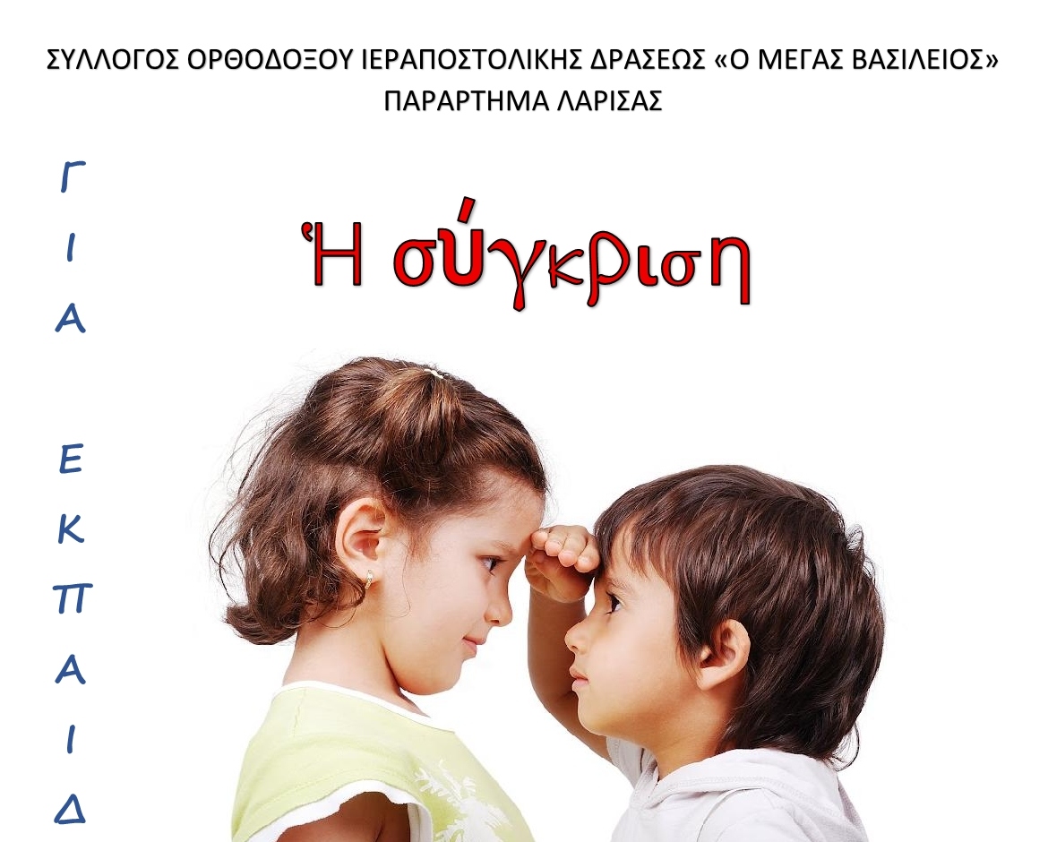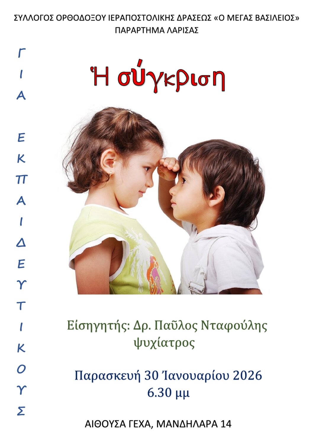 Ο Σύλλογος Ορθοδόξου Ιεραποστολικής Δράσεως «Ο Μέγας Βασίλειος» (Παράρτημα Λάρισας) διοργανώνει και φέτος την καθιερωμένη πλέον, με αφορμή τη γιορτή των Τριών Ιεραρχών, εκδήλωση για εκπαιδευτικούς, την Παρασκευή 30 Ιανουαρίου 2026, ώρα 6.30 μ.μ. στην αίθουσα της ΓΕΧΑ, Μανδηλαρά 14, με θέμα: Η σύγκριση. Εισηγητής θα είναι ο δρ. Παύλος Νταφούλης, ψυχίατρος.