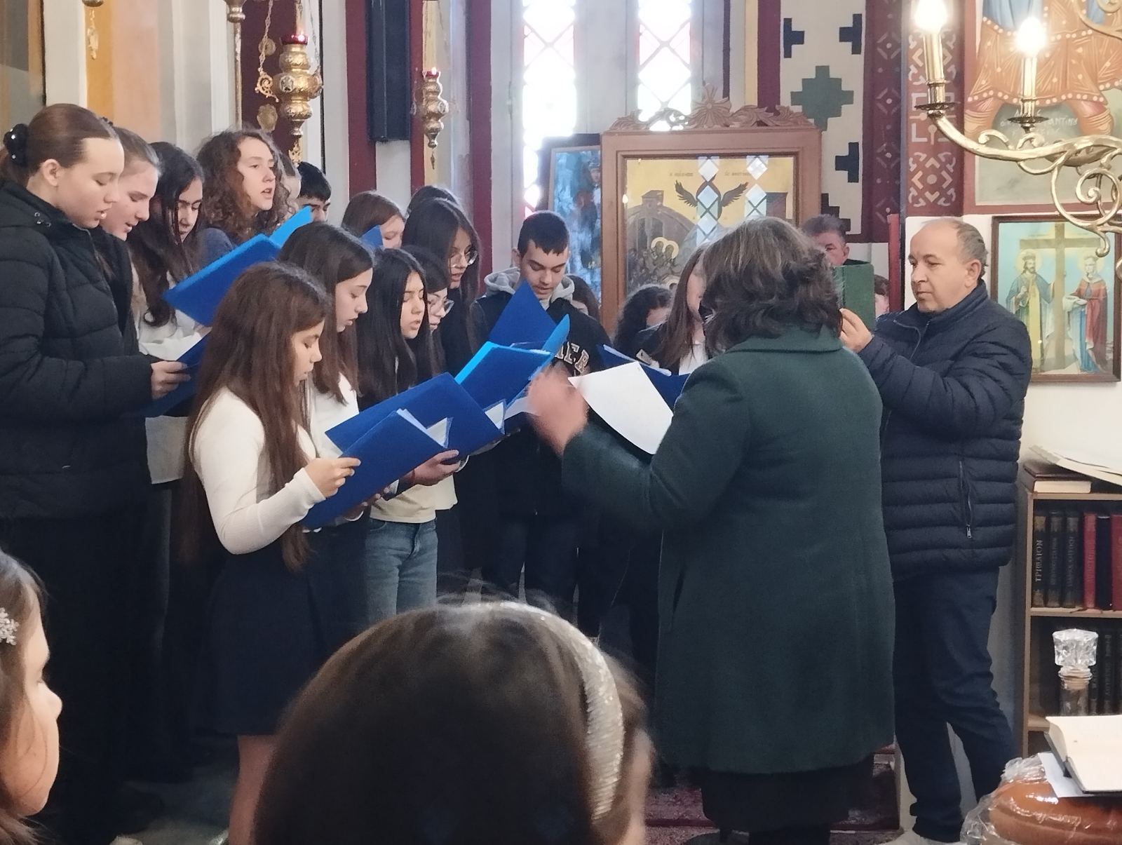 Στον ιερό χώρο αποδόθηκαν μελωδικά από καλλίφωνους ιεροψάλτες του ιερού Ναού ψαλμοί και ύμνοι ακολουθίας της σημερινής εορτής, καθώς και το Απολυτίκιο των Αγίων πριν την ευλογία της αρτοκλασίας από το μουσικό χορωδιακό σύνολο του σχολείου. Επίσης, απαγγέλθηκε ο εορταστικός πανηγυρικός λόγος προς τιμήν των Αγίων από την εκπαιδευτικό Θεολόγο του Λυκείου Αμπελώνα.