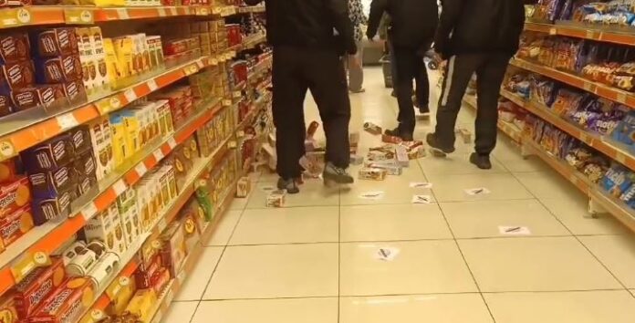 Μέλη του αντιεξουσιαστικού χώρου έκαναν σήμερα “έφοδο” σε μάρκετ του Βόλου, άρχισαν να πετούν τρικάκια και να “κατεβάζουν” από τα ράφια προϊόντα της “Βιολάντα”. Ποδοπατούσαν τα μπισκότα και οι πελάτες ήταν αποσβολωμένοι.