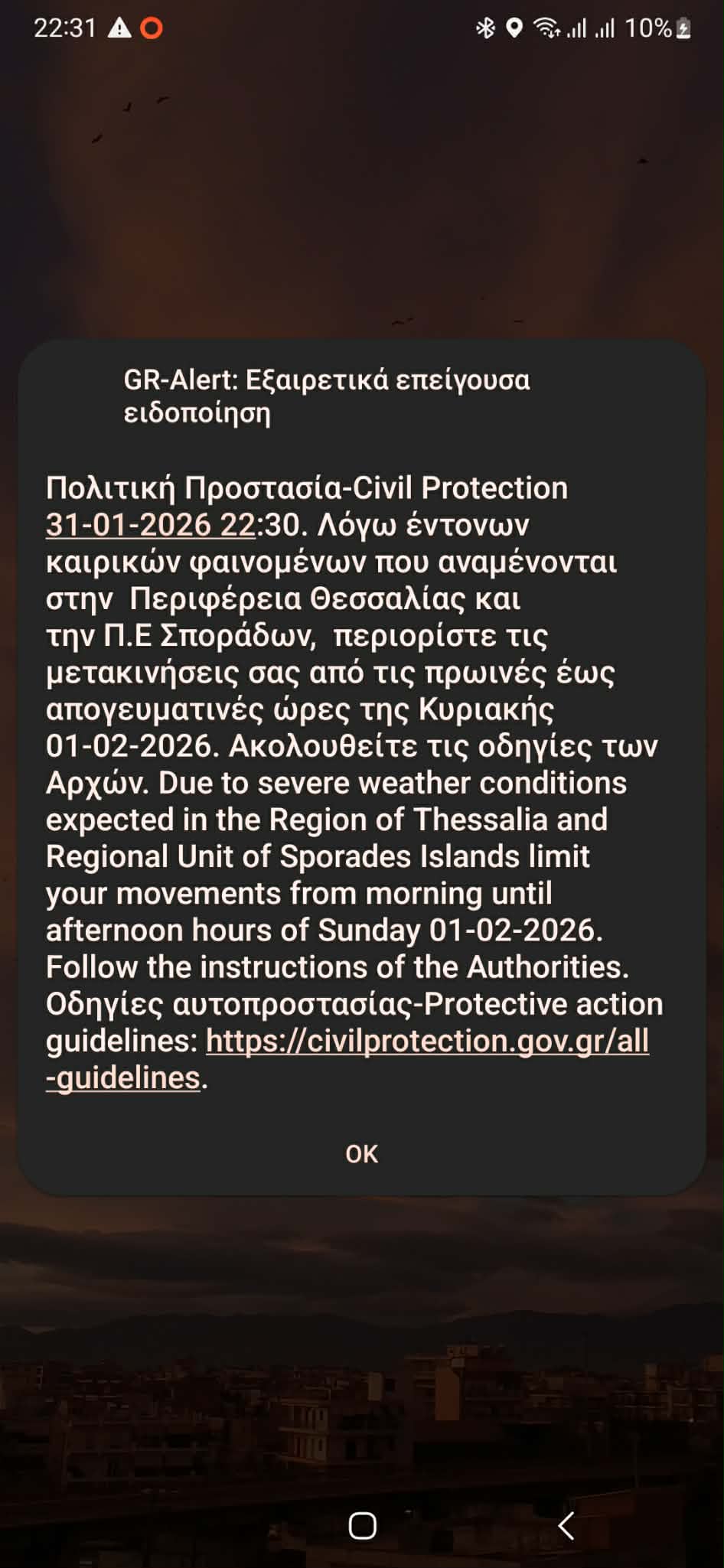 «31-01-2026 22:30. Λόγω έντονων καιρικών φαινομένων που αναμένονται στην Περιφέρεια Θεσσαλίας και την Π.Ε Σποράδων, περιορίστε τις μετακινήσεις σας από τις πρωινές έως απογευματινές ώρες της Κυριακής 01-02-2026. Ακολουθείτε τις οδηγίες των Αρχών».