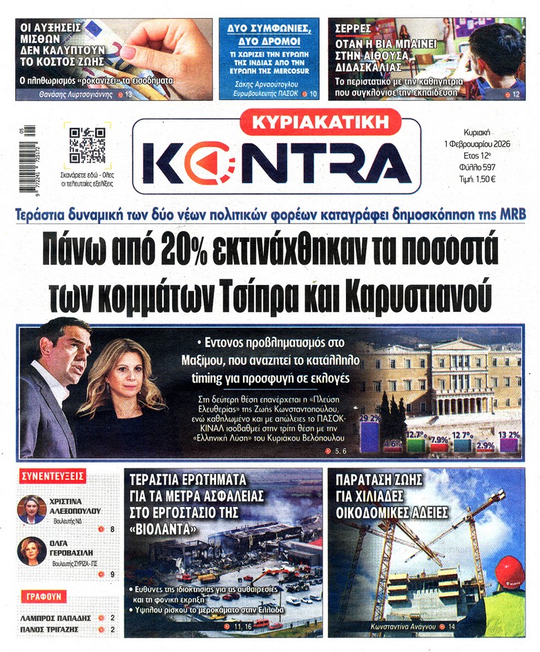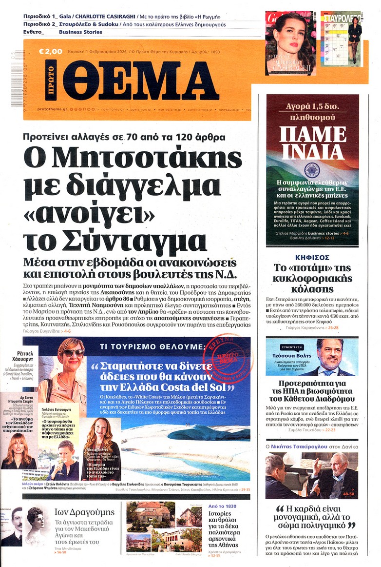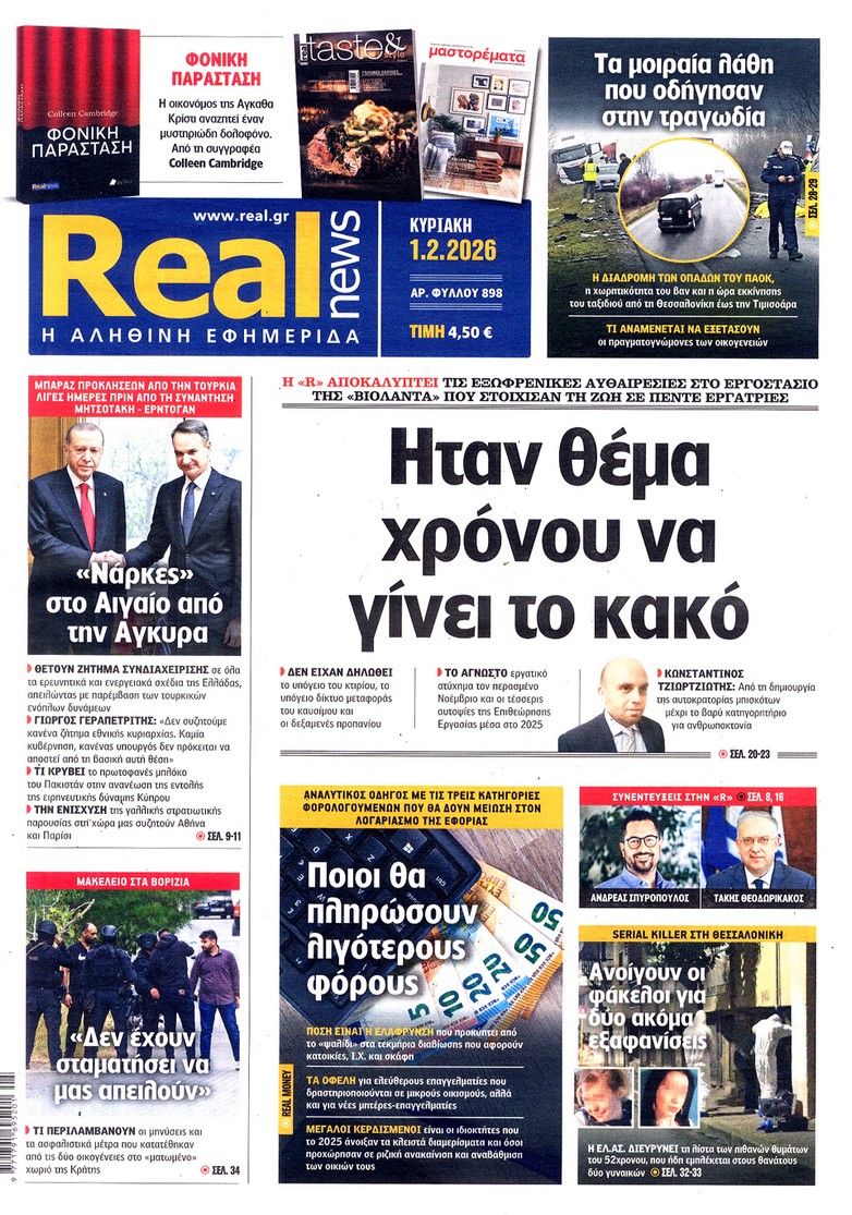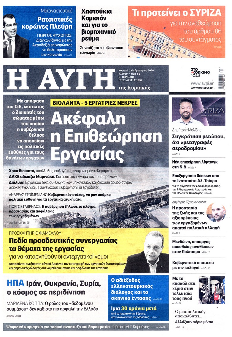 Τα Ελληνοτουρκικά με τα αγκάθια πριν από το ραντεβού Μητσοτάκη-Ερντογάν, οι αλλαγές που ετοιμάζεται να προτείνει ο πρωθυπουργός για το Σύνταγμα, τα όσα έγιναν στο εργοστάσιο της Βιολάντα που έφεραν την τραγωδία, αλλά και η «βαβέλ» των συνεργασιών στο δρόμο για τις κάλπες, ξεχωρίζουν στα πρωτοσέλιδα των κυριακάτικων εφημερίδων.