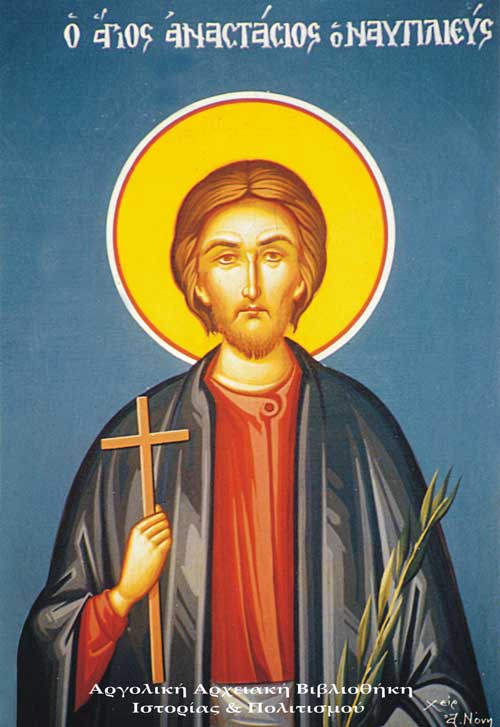 Ο ΝΕΟΣ ΑΓΙΟΓΡΑΦΟΣ ΤΟΥ ΝΑΥΠΛΙΟΥ: Ο Αναστάσιος γεννήθηκε στο Ναύπλιο στις αρχές του 17ου αιώνα. Ήταν έξυπνος και ταλαντούχος, με ιδιαίτερο χάρισμα στη ζωγραφική. Κι επειδή από μικρός αγαπούσε πολύ τον Χριστό και τους Αγίους της Εκκλησίας, θέλησε να ασχοληθεί με την Αγιογραφία. Μαθήτευσε κοντά σε σπουδαίους δασκάλους της αγιογραφίας, όπως ήταν οι αδελφοί Δημήτριος και Γεώργιος Μόσχου, ενώ επισκέφθηκε και το Άγιον Όρος, για να μελετήσει τοιχογραφίες σε διάφορες Μονές και να βελτιώσει την τεχνική του. Εκείνο τον καιρό ξέσπασε ο Ενετο-τουρκικός πόλεμος στην Κρήτη(1645-1669), γεγονός που πυροδότησε το φανατισμό των Οθωμανών, ο οποίος μεταδόθηκε και στο Ναύπλιο, λιμάνι σε καίρια θέση που χρησίμευε ως βάση για ανεφοδιασμό των τούρκων.