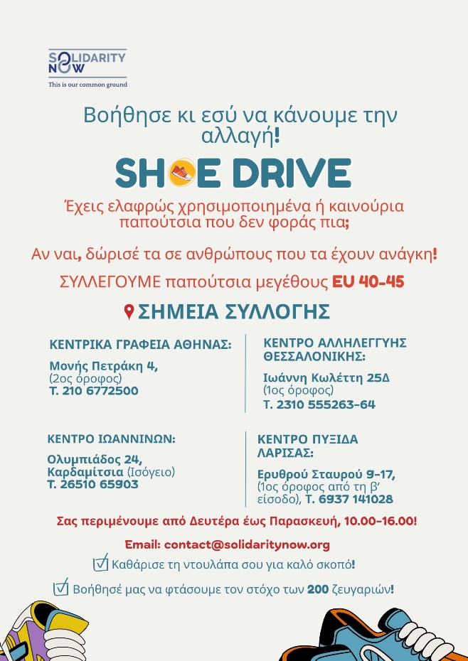Το ΠΟΚΕΛ – Πολιτιστικό Κέντρο Εκπαιδευτικών νομού Λάρισας συμμετείχε στο κάλεσμα από το «SolidarityNow» και προσέφερε αρκετά ζευγάρια αντρικά παπούτσια.