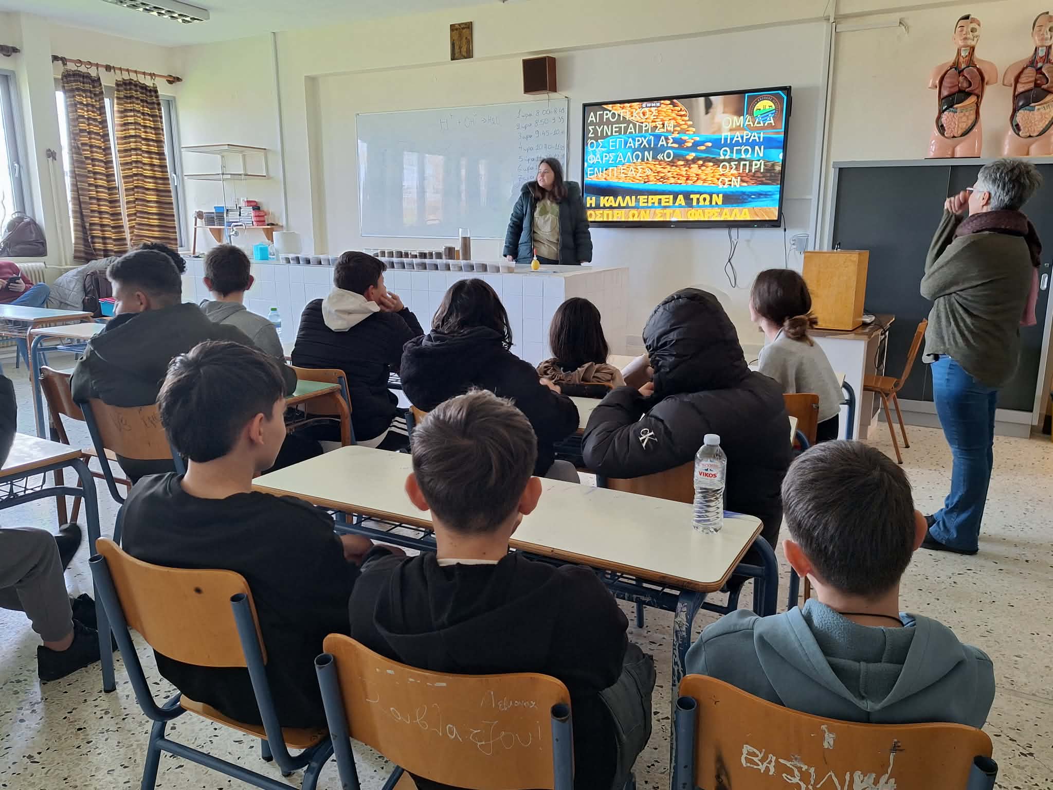 Η κ.Χαρούλα Καρατοσίδου μας μίλησε για την καλλιέργεια οσπρίων και ανέδειξε τον καθοριστικό τους ρόλο στην αζωτοδέσμευση, μια φυσική διαδικασία που καθιστά τη γη μας γόνιμη. Παράλληλα, ενημέρωσε τους μαθητές για τη λειτουργία του Αγροτικού Συνεταιρισμού, εξηγώντας πώς η συλλογικότητα και η σωστή τυποποίηση δίνουν διεθνή ταυτότητα και αξία στα τοπικά προϊόντα.