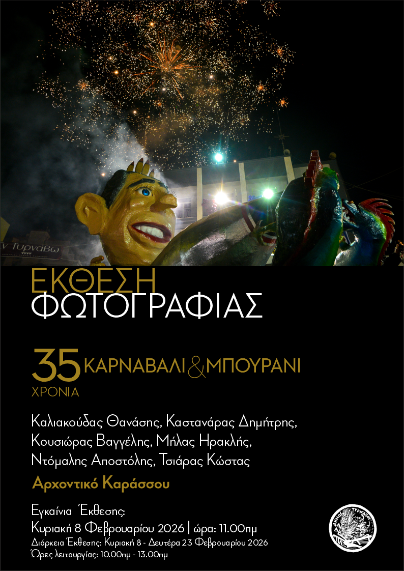 Ο Δήμος Τυρνάβου και η Αντιδημαρχία Πολιτισμού διοργανώνουν έκθεση φωτογραφίας με τίτλο «35 Χρόνια Καρναβάλι – Μπουρανί», η οποία θα εγκαινιαστεί την Κυριακή 8 Φεβρουαρίου, στις 11.00 π.μ., στο Αρχοντικό Καράσσου, στον Τύρναβο.