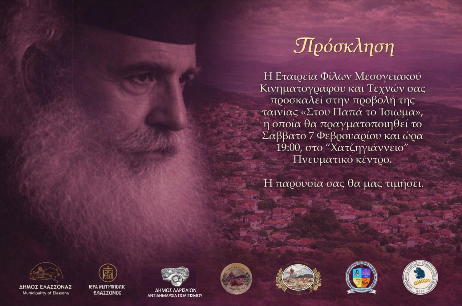 Η Εταιρία Φίλων Μεσογειακού Κινηματογράφου και Τεχνών, στο πλαίσιο των δράσεων του 29ου Μεσογειακού Φεστιβάλ Ταινιών Μικρού Μήκους Νέων Κινηματογραφιστών, πραγματοποιεί το Σάββατο 7 Φεβρουαρίου 2026, στις 19:00, στο Χατζηγιάννειο Πνευματικό Κέντρο στη Λάρισα, την προβολή της κινηματογραφικής ταινίας «Στου Παπά το Ίσιωμα» της Λαρισαίας Σκηνοθέτιδας Ειρήνης Ζγούρη.