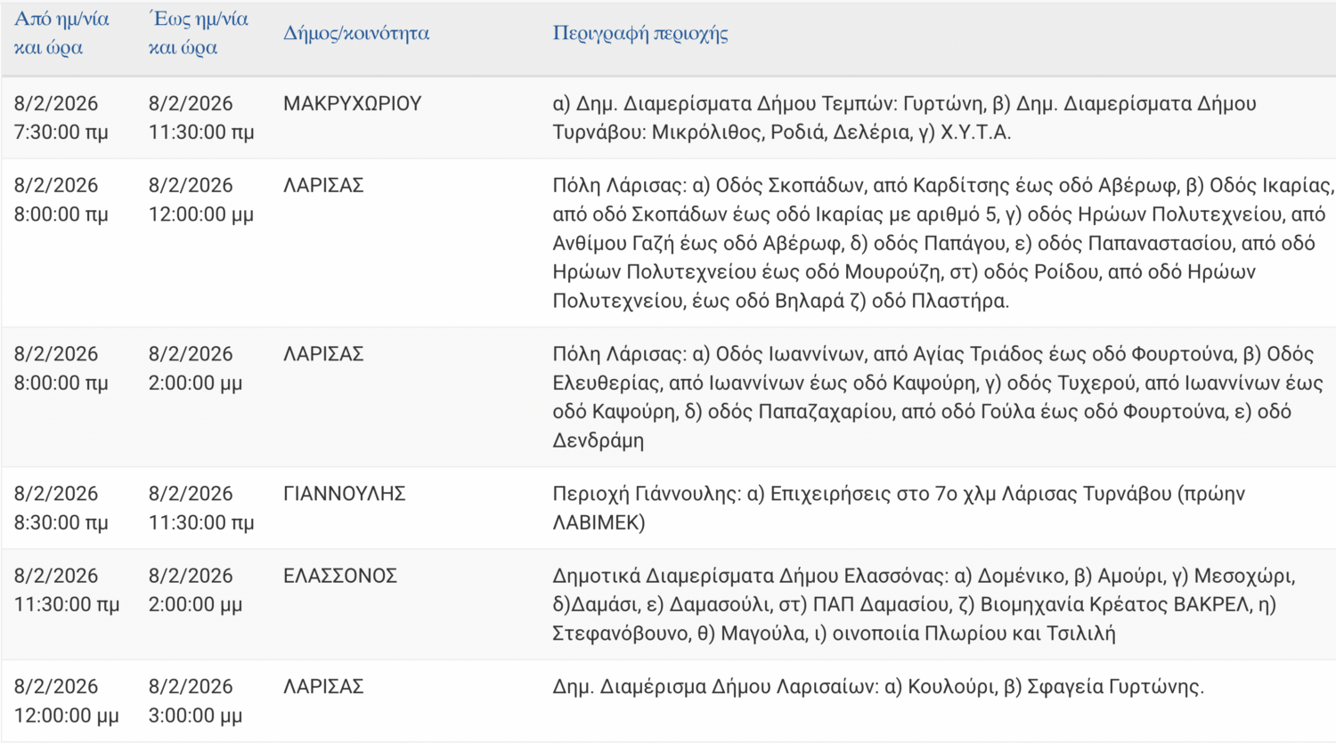 Σε προγραμματισμένες διακοπές στην παροχή ηλεκτρικού ρεύματος σε δρόμους της Λάρισας και περιοχές της Περιφερειακής Ενότητας θα προχωρήσει την Κυριακή 8 Φεβρουαρίου 2026 ο ΔΕΔΔΗΕ Α.Ε.