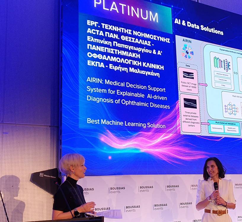 Δύο σημαντικές διακρίσεις, Platinum και Gold, απέσπασε το Εργαστήριο Τεχνητής Νοημοσύνης, Υπολογιστικών Συστημάτων και Τεχνολογικών Εφαρμογών (ACTA Lab) του Τμήματος Συστημάτων Ενέργειας του Πανεπιστημίου Θεσσαλίας, σε συνεργασία με την και η Α΄ Πανεπιστημιακή Οφθαλμολογική Κλινική του Εθνικού και Καποδιστριακού Πανεπιστημίου Αθηνών (ΕΚΠΑ), στα AI & Data Awards 2026, για το έργο AIRIN: Medical Decision Support System for Explainable AI-driven Diagnosis of Ophthalmic Diseases.