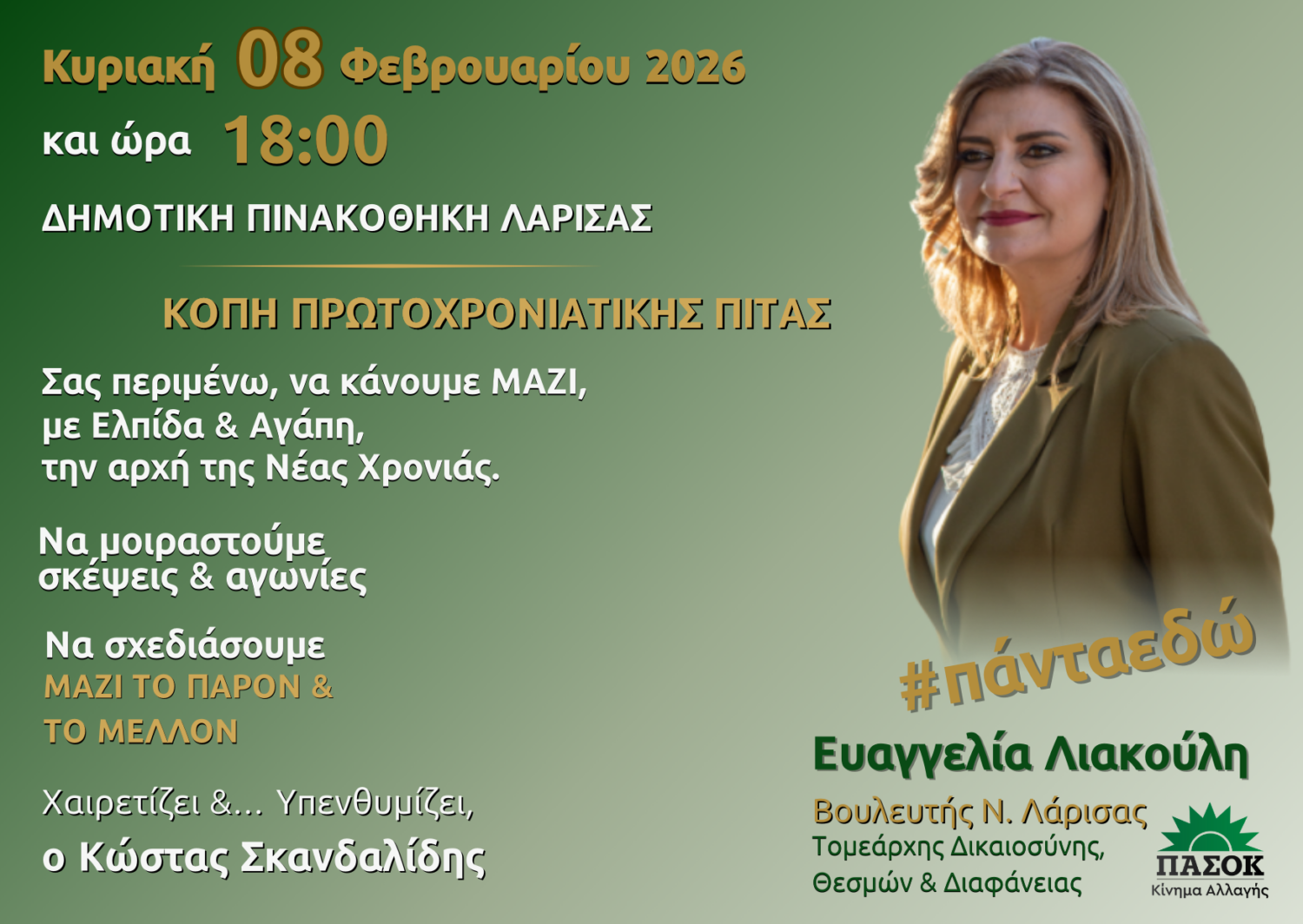 Με συγκινητικές στιγμές της παλιάς Λάρισας, βραβεύσεις του πρώην Δημάρχου Λαρισαίων Χριστόδουλου Καφφέ και του Ιατρού –Ιστοριοδίφη Νίκου Παπαθεοδώρου, θα πραγματοποιηθεί αύριο, Κυριακή 8 Φεβρουαρίου 2026, ώρα 18:00, στη Δημοτική Πινακοθήκη – Μουσείο Γ.Ι. Κατσίγρα στη Λάρισα, η ετήσια εκδήλωση του γραφείου της Τομεάρχη Δικαιοσύνης του ΠΑΣΟΚ – Κινήματος Αλλαγής και Βουλευτή Λάρισας, Ευαγγελίας Λιακούλη, παρουσία του Κώστα Σκανδαλίδη.