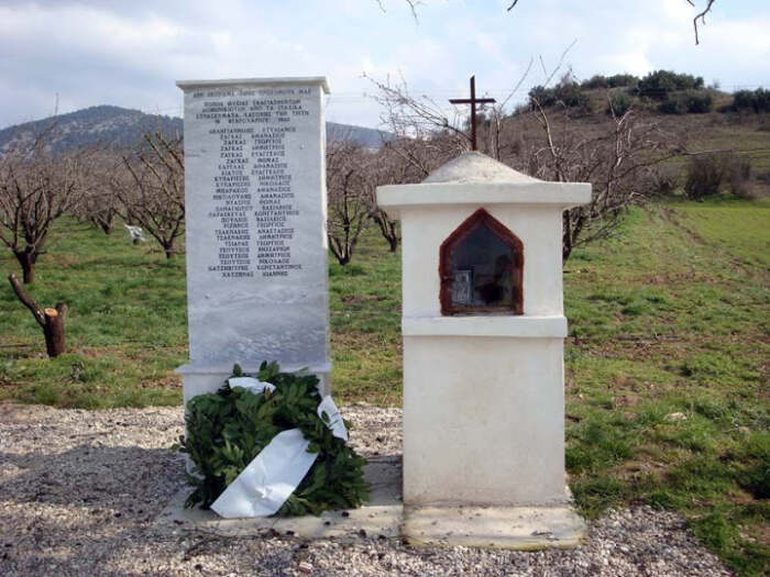 Ο ΟΙΚΤΡΟΣ και ΟΔΥΝΗΡΟΣ ΘΑΝΑΤΟΣ ΤΟΥ ΙΕΡΕΑ: Από τη δολοφονική μανία των κατακτητών σώθηκαν μόλις έξι. Ένας ήταν ο Πέτρος Κιάτος που μπόρεσε και δραπέτευσε πυροβολούμενος (έσπρωξε τον Ιταλό σκοπό και έτρεξε μέσα στα πουρνάρια) και οι υπόλοιποι (Γιώργος Κιάτος, Ευάγγελος Ντάσιος, Χρήστος Κυπαρρίσης, Βασίλης Ζάγκας και Σωτήρης Δισακόπουλος), μπόρεσαν και κρύφτηκαν κάτω από τα πτώματα των υπολοίπων εκτελεσθέντων. Ο Χρήστος Κυπαρίσσης την ώρα της εκτέλεσης πυροβολήθηκε στο πόδι και λιποθύμησε με αποτέλεσμα να τον αφήσουν, καθώς νόμιζαν ότι είχε πεθάνει. Η εκτέλεση διήρκεσε αρκετές ώρες με διάφορες διμοιρίες να αλλάζουν βάρδιες. Συμμετείχαν ο κανονικός στρατός καθώς και μονάδες Μελανοχιτώνων. Τραγικό θάνατο βρήκε ο ιερέας του χωριού πατήρ Δημήτριος Ευαγγέλου, ο οποίος τους εκλιπαρούσε να δείξουν έλεος, καθώς οι συγχωριανοί του ήταν αμέτοχοι στην ενέδρα. Τον άρπαξε όμως ένας Ιταλός και προσπάθησε να του ξεριζώσει τα γένια. Στη συνέχεια τού τα έβαλε φωτιά, κρατώντας τον μάλιστα από τα χέρια για να νιώσει περισσότερο πόνο και μετά τον πυροβόλησε…