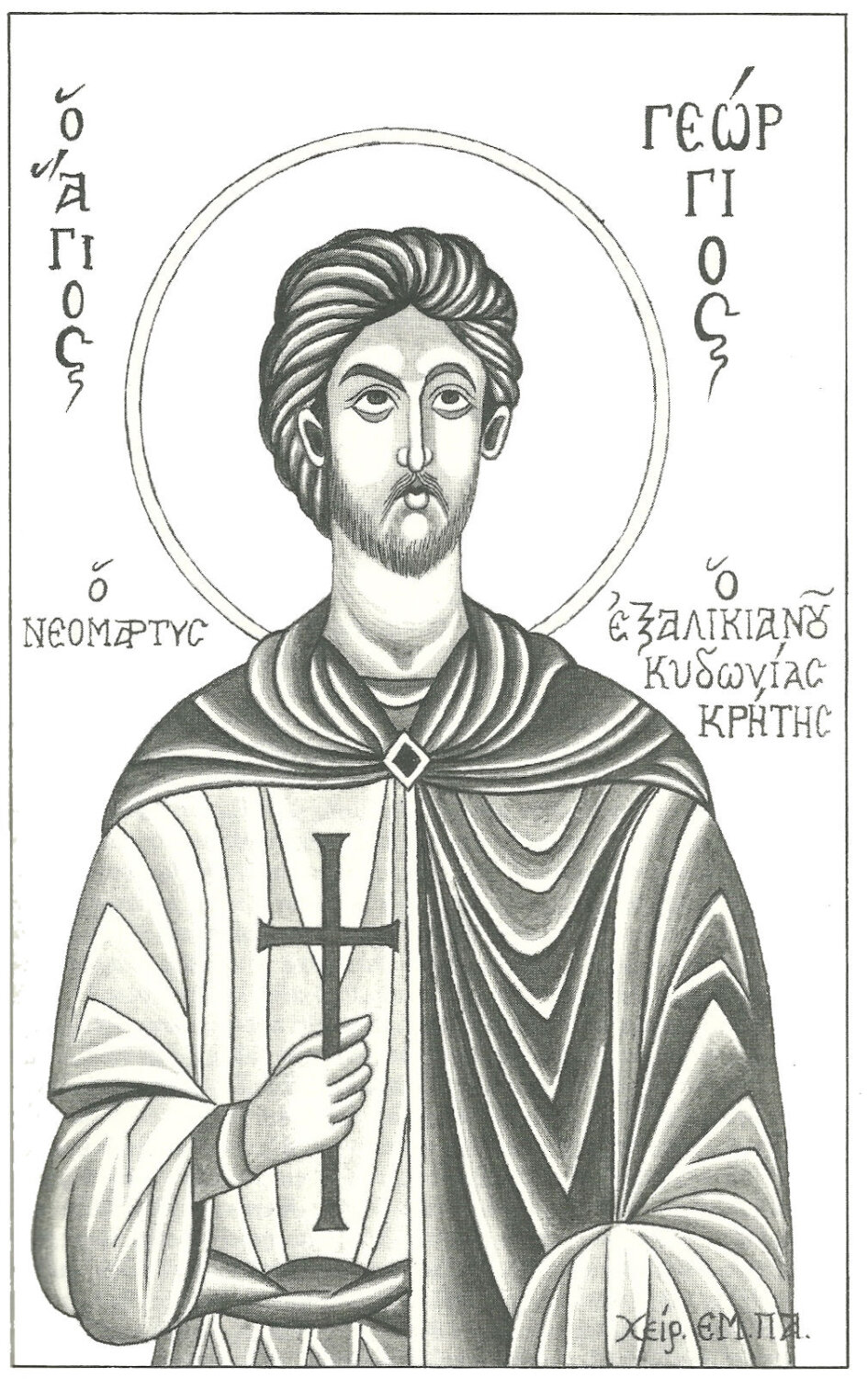 ΚΑΤΑΓΩΓΗ – ΝΕΟΤΗΣ ΤΟΥ ΓΕΩΡΓΙΟΥ: Ο Άγιος Γεώργιος ο Νεομάρτυς του Χριστού γεννήθηκε στην Κρήτη, χωριό Αλικιανού Κυδωνίας, την 24η Μαΐου του 1846 από ευγενείς γονείς, τον Ιερέα Νικόλαο Διβόλη, που καταγόταν από τη Φολέγανδρο, και την Αικατερίνη Μπουζιανοπούλου, καταγόμενη από την σημαντικότερη οικογένεια του Θέρισσου της Κυδωνίας. Στο Θέρισσο μετέβη και ο πατέρας του ως εφημέριος. Εκεί ο Γεώργιος ανετράφη εν παιδεία και νουθεσία Κυρίου. Ο Γεώργιος έμαθε και λίγα γράμματα, ίσα-ίσα να μπορεί να διαβάζει. Κι όμως εκείνα τα λίγα τον ωφέλησαν ιδιαίτερα. Ο Νεομάρτυς του Χριστού, εργαζόταν ως γεωργός. Μετά τη σκληρή ολοήμερη δουλειά στα αμπέλια και έπειτα από το δείπνο, διάβαζε συναξάρια των Αγίων της Ορθοδοξίας μας, ιδιαιτέρως δε των Μαρτύρων. Αυτό το έκανε κάθε βράδυ, μέχρι τα μεσάνυχτα. Του έλεγαν μάλιστα συχνά οι γονείς του: “Παιδί μου πρέπει να κοιμηθείς, να ξεκουραστείς, αύριο πάλι έχεις εργασία”. Και ο Γεώργιος συνήθιζε να τους απαντά: “Δεν αναπαύομαι ούτε κοιμούμαι ευχάριστα, εάν πρώτα δεν χορτάσω από θεία ανάγνωση”.