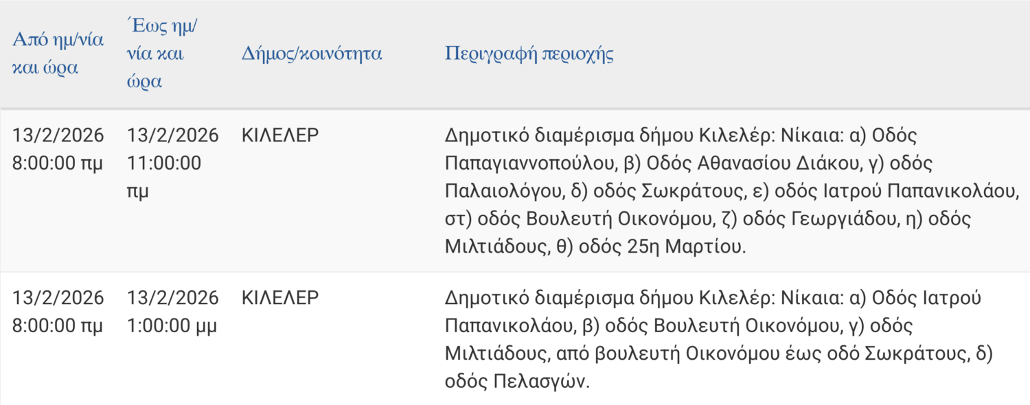 Σε προγραμματισμένες διακοπές στην παροχή ηλεκτρικού ρεύματος σε δρόμους της Νίκαιας Δήμου Κιλελέρ θα προχωρήσει την Παρασκευή 13 Φεβρουαρίου 2026 ο ΔΕΔΔΗΕ Α.Ε.