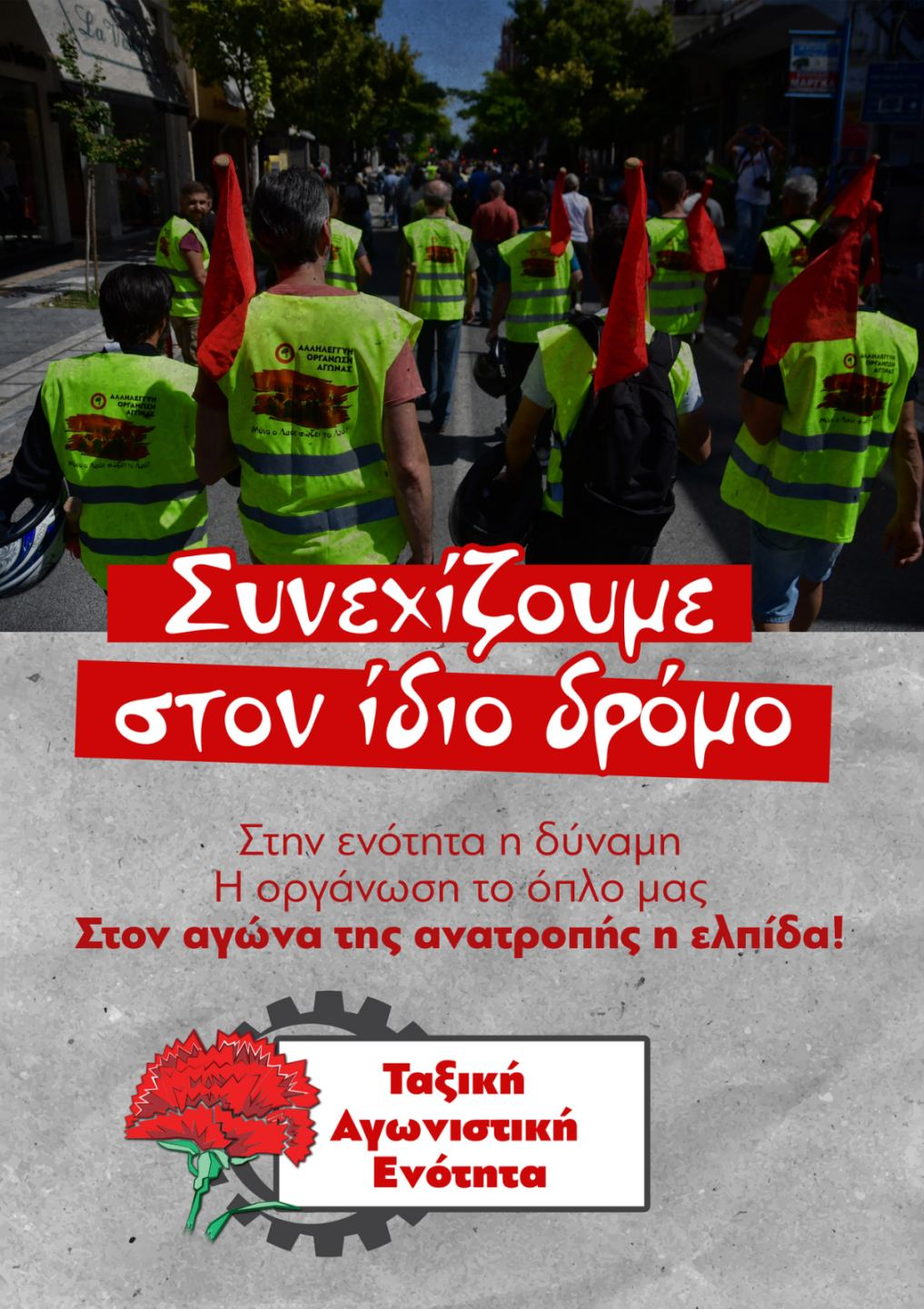 Σε αυτό τον δρόμο συνεχίζουμε κάνοντας το αποφασιστικό βήμα για την οργάνωση της πάλης µας, για να ισχυροποιηθεί το ρεύμα κοινής δράσης των συνδικάτων, µε βάση τις δικές μας ανάγκες και όχι τα κέρδη των λίγων.