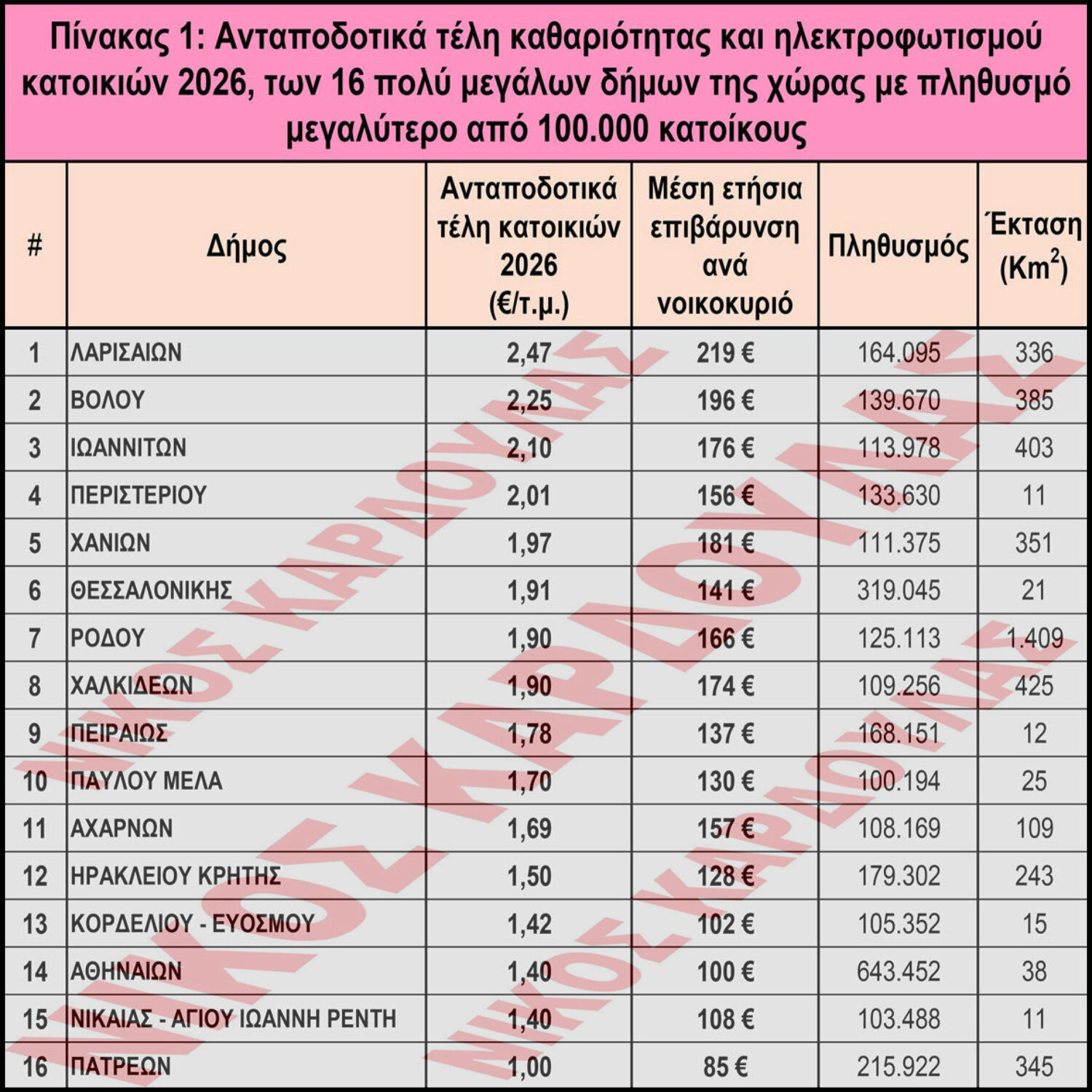 Ανταποδοτικά τέλη καθαριότητας και ηλεκτροφωτισμού κατοικιών 2026, των 16 πολύ μεγάλων δήμων της χώρας με πληθυσμό μεγαλύτερο από 100.000 κατοίκους