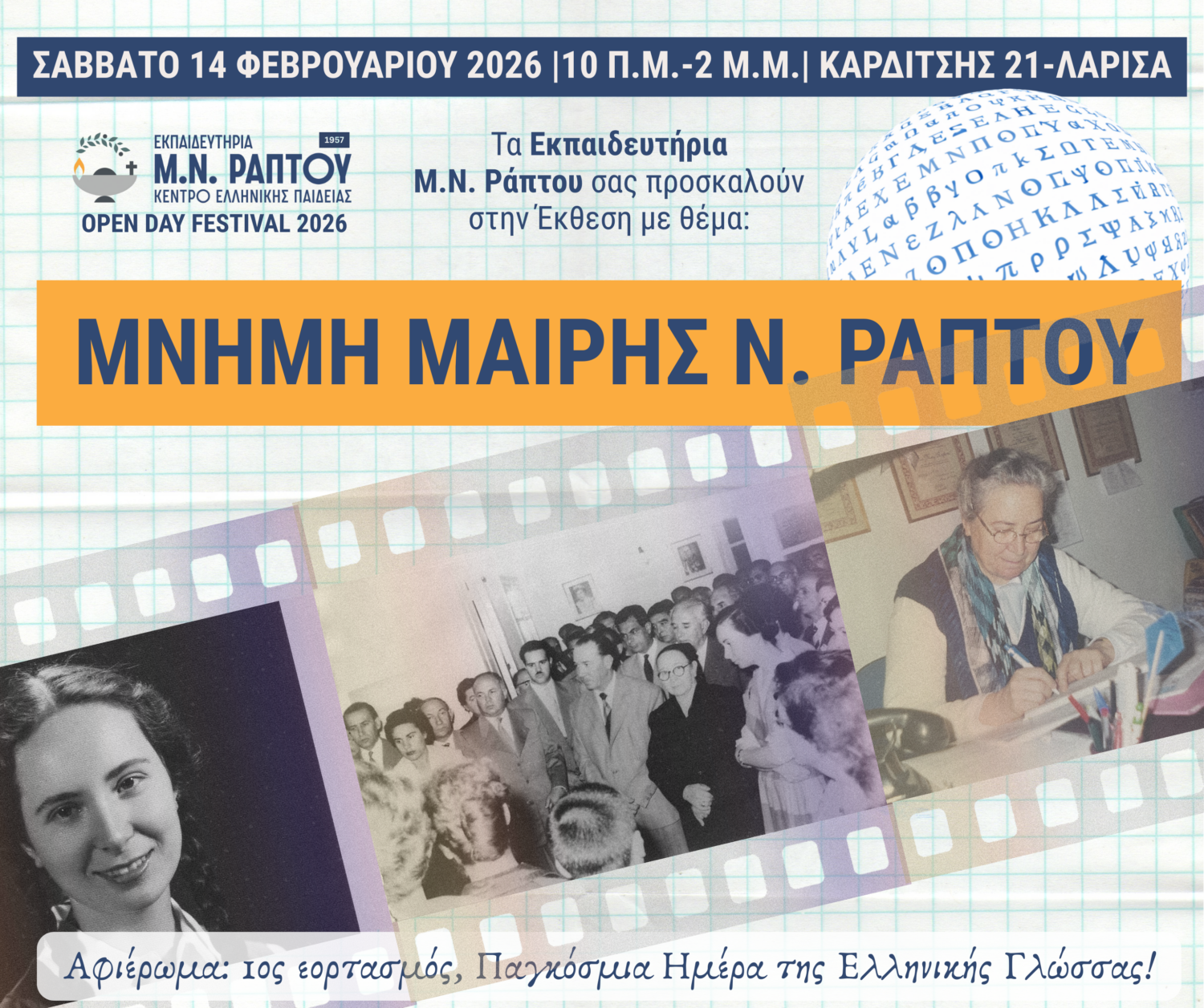 Ανάμεσα στις πολλές δραστηριότητες, τα εργαστήρια, τις παρουσιάσεις και τις ομιλίες, οι οποίες θα φιλοξενούνται στα Εκπαιδευτήρια Μ.Ν. Ράπτου το Σάββατο 14/2/2026 το πρωί (από τις 10 π.μ. έως 2 μ.μ.) ξεχωρίζει η αίθουσα που είναι αφιερωμένη στη μνήμη της Μαίρης Ν. Ράπτου, που ίδρυσε το σχολείο το 1957 και ήταν η υπεύθυνός του για εξήντα και πλέον χρόνια, ουσιαστικά έως την εκδημία της, το 2022.