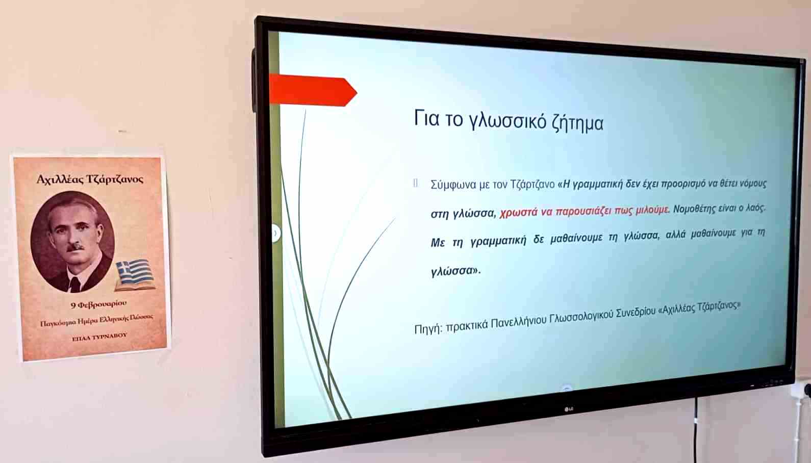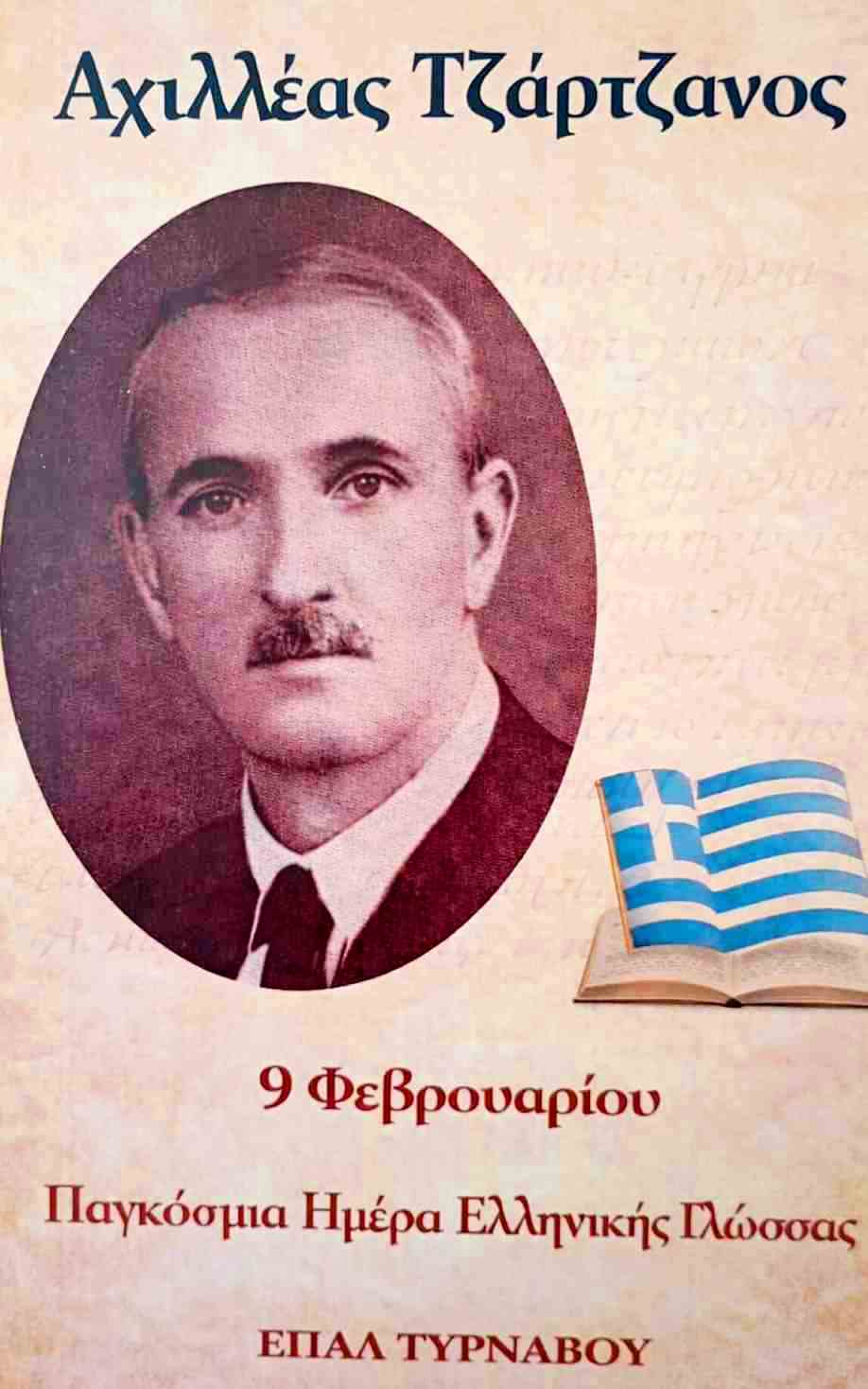 Το ΕΠΑΛ Τυρνάβου, με αφορμή τον εορτασμό της Παγκόσμιας Ημέρας Ελληνικής Γλώσσας (9 Φεβρουαρίου), πραγματοποίησε εκδήλωση αφιερωμένη στη ζωή και το έργο του μεγάλου δασκάλου του Τυρνάβου, Αχιλλέα Τζάρτζανου.
