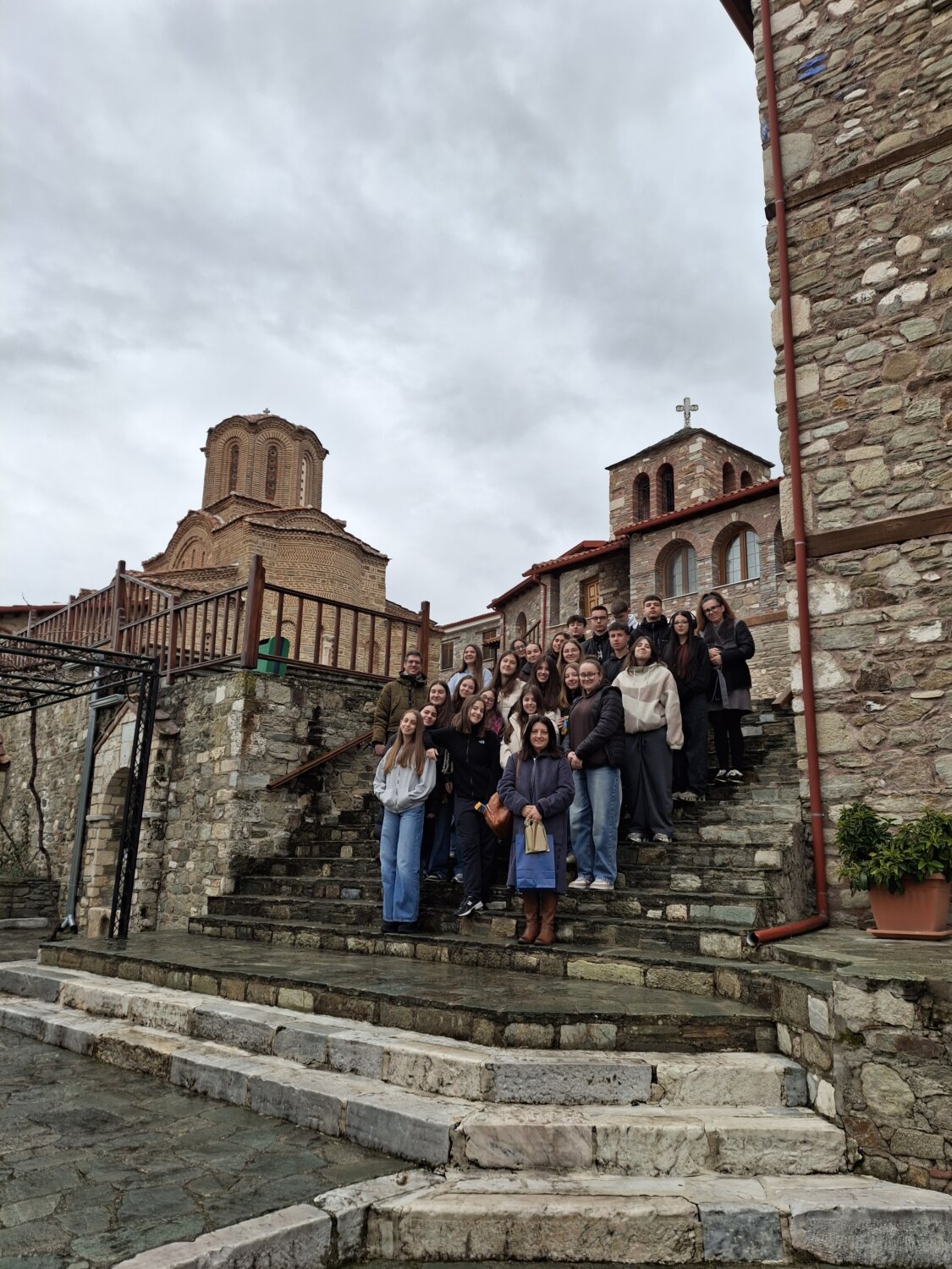 Οι μαθητές και οι μαθήτριες αρχικά επισκέφτηκαν την Ιερά Μονή Παναγίας Ολυμπιωτίσσης Ελασσόνας, όπου και είχαν την ευκαιρία να ακούσουν πληροφορίες για την ιστορία της Μονής και την θαυματουργή εικόνα της Παναγίας από την ηγουμένη της Μονής. Στο αρχονταρίκι έλαβαν κέρασμα και έψαλλαν στην αδελφότητα ύμνους και τροπάρια, συζητώντας παράλληλα για τον ρόλο της Ιεράς Μονής στην πορεία των αιώνων.