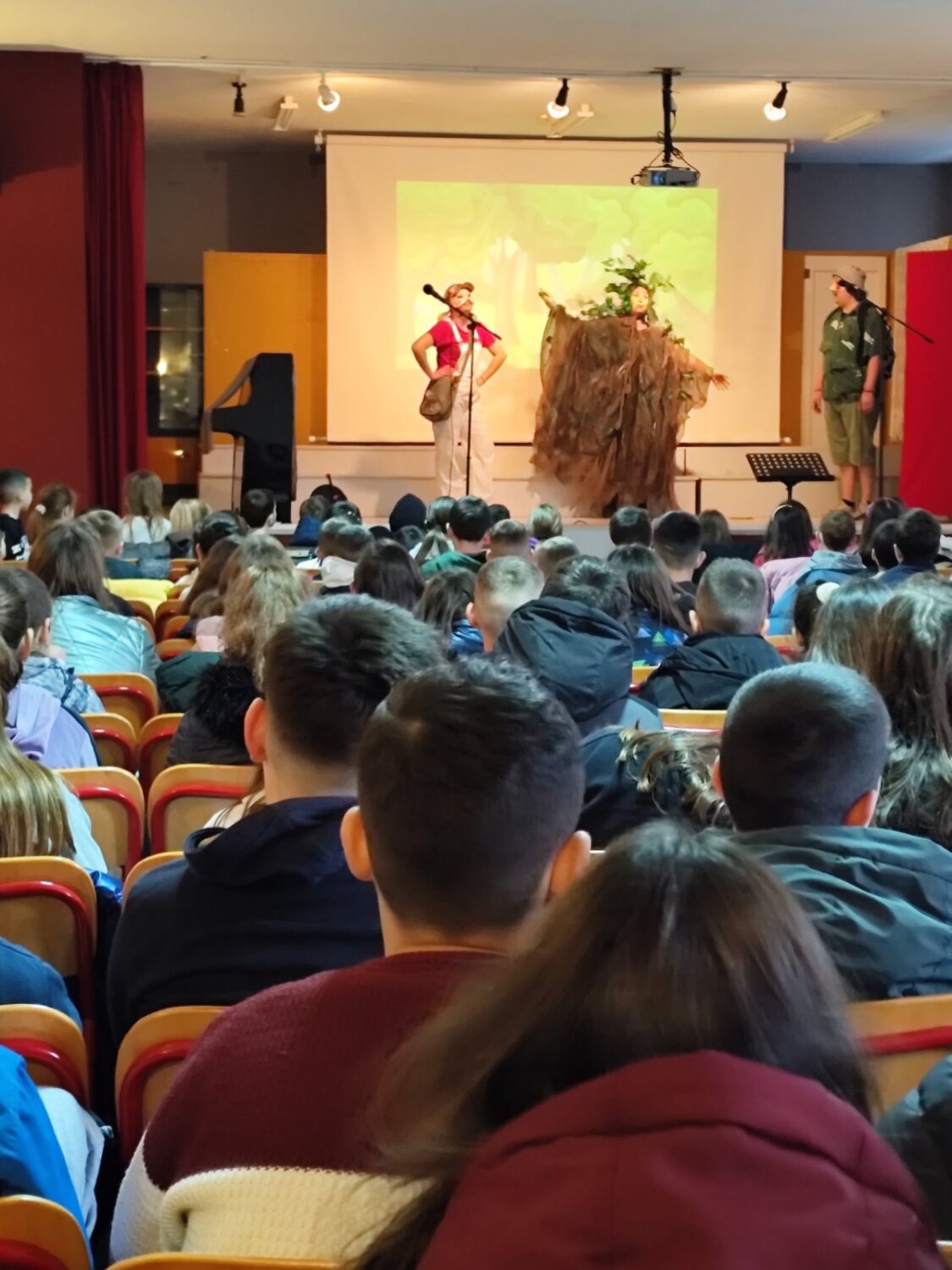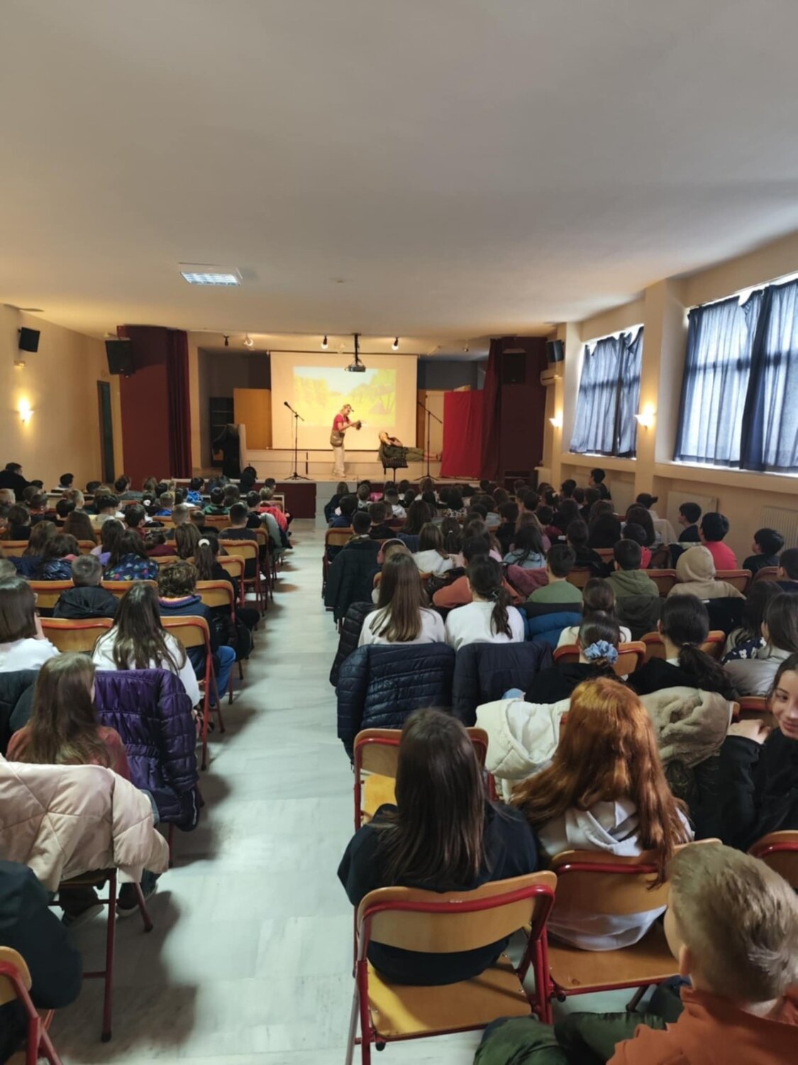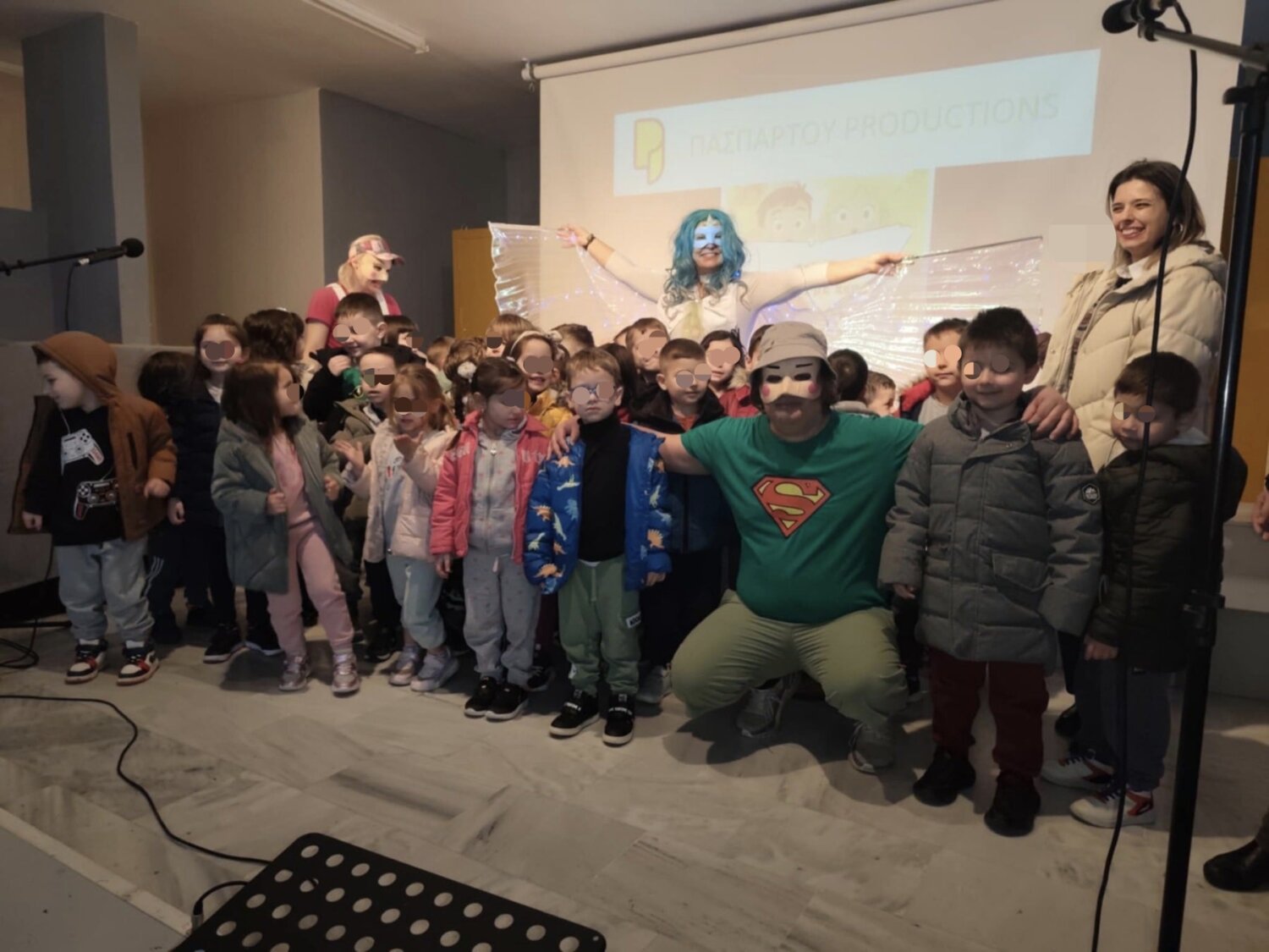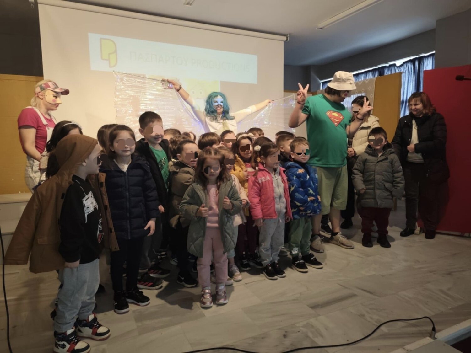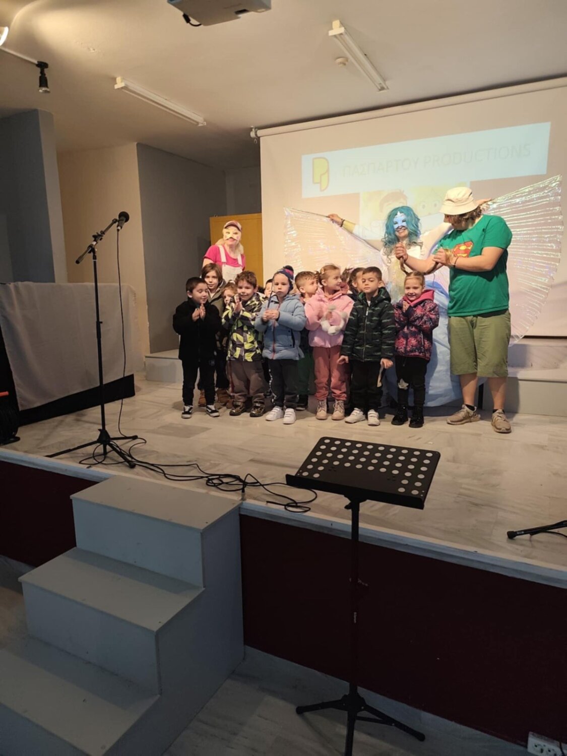Ηθοποιοί και μικροί θεατές γέμισαν τη σκηνή με χαρά, γέλιο και τραγούδι, δημιουργώντας μια ζεστή και γιορτινή ατμόσφαιρα.
