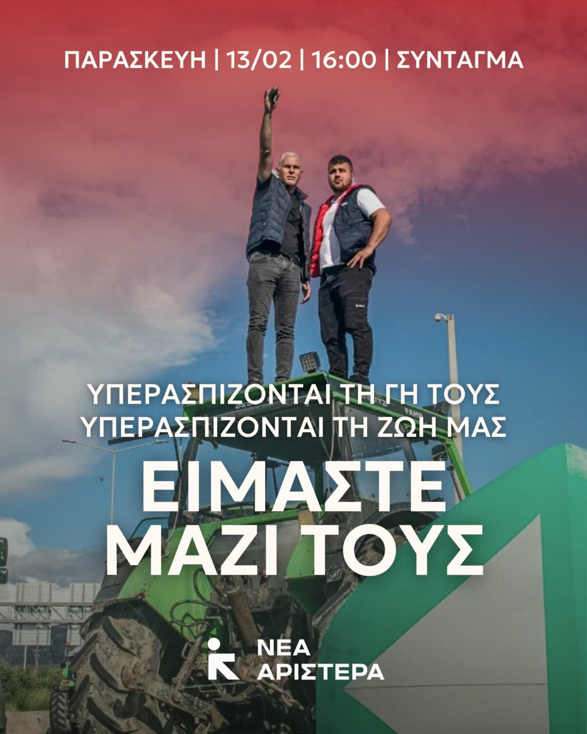 Η Νέα Αριστερά εκφράζει την αλληλεγγύη και τη στήριξή της στους αγρότες, κτηνοτρόφους, μελισσοκόμους και αλιείς που κινητοποιούνται, διεκδικώντας αξιοπρεπείς όρους επιβίωσης και ουσιαστική προοπτική για τον πρωτογενή τομέα.
