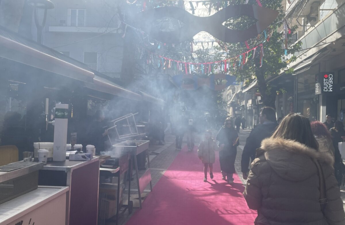 Οι καπνοί, κυρίως έξω από καταστήματα εστίασης, είναι ευδιάκριτοι, ενώ την ίδια ώρα κορυφώνονται οι προετοιμασίες στην Κεντρική Πλατεία ενόψει της εκδήλωσης με τον Τόνι Σφήνο.