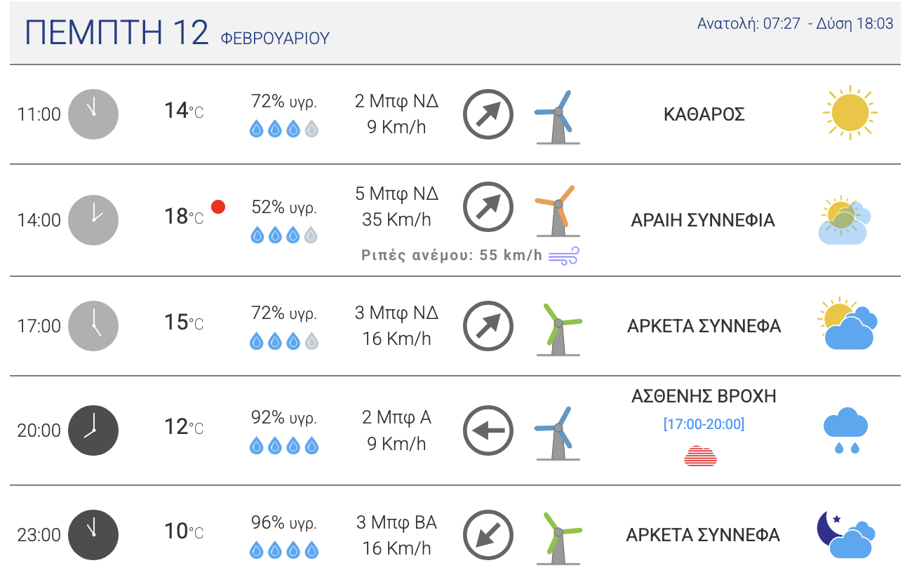 Ανεμοι: Ανατολικοί βορειοανατολικοί 3 με 5 και στα ανατολικά θαλάσσια 6 μποφόρ από το μεσημέρι νοτίων διευθύνσεων έως 4 μποφόρ.