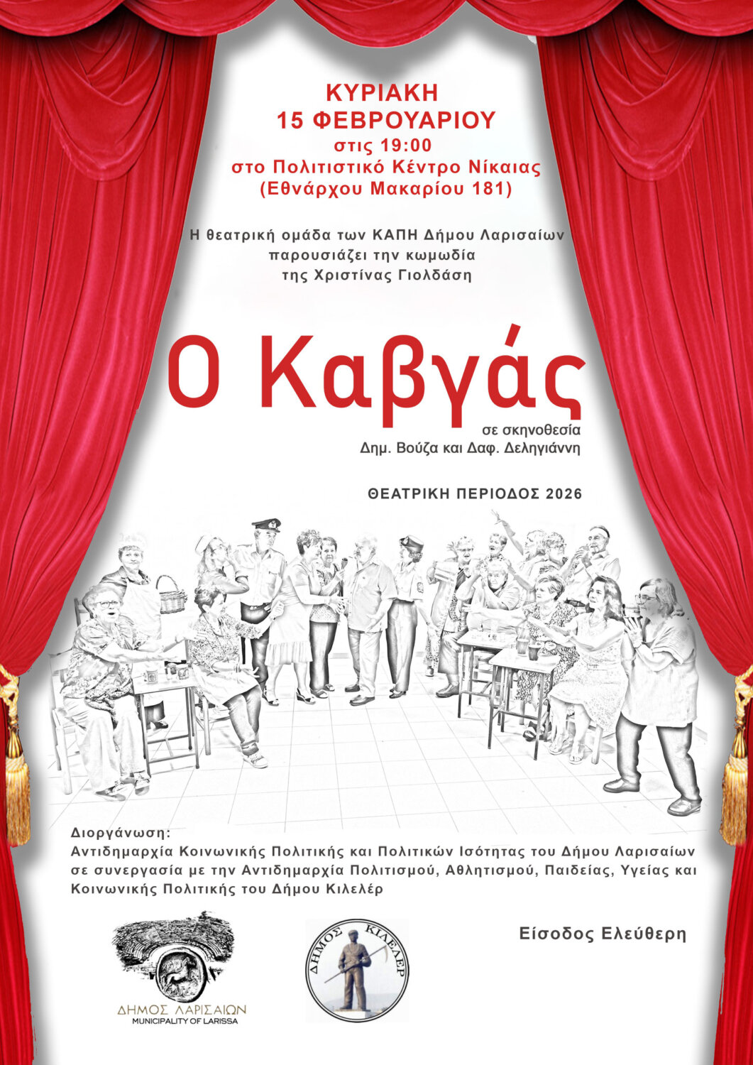 Η θεατρική ομάδα του Τμήματος ΚΑΠΗ, της Αντιδημαρχίας Κοινωνικής Πολιτικής και Πολιτικών Ισότητας του Δήμου Λαρισαίων, παρουσιάζει την κωμωδία «Ο Καβγάς» της Χριστίνας Γιολδάση-Τσιαούση.