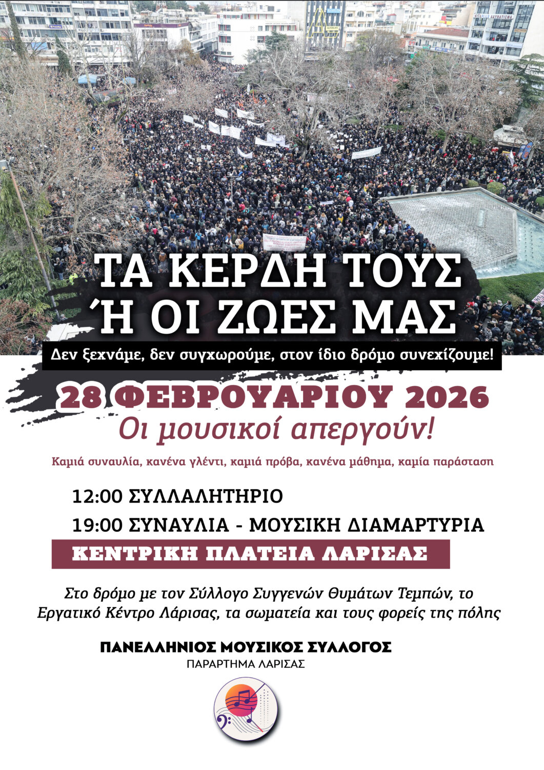Σε συνεδρίαση της, η Διοίκηση του Παραρτήματος Λάρισας του Πανελλήνιου Μουσικού Συλλόγου αποφάσισε και καλεί σε κλαδική 24ωρη Απεργία όλους τους μουσικούς και καλλιτέχνες του Νομού Λάρισας το Σάββατο 28 Φεβρουαρίου. Το Σωματείο μας καλεί όλους τους συναδέλφους, όλα τα σωματεία και τους φορείς πολιτισμού της Λάρισας να συμβάλουν να μη γίνει στις 28/2/26 καμιά συναυλία, κανένα γλέντι, καμιά πρόβα, κανένα μάθημα, καμία παράσταση. Την Παρασκευή 13/2/26 ο ΠΜΣ συμμετέχει στο μεγάλο Λαϊκό Συλλαλητήριο στο Σύνταγμα, δίνοντας μια πρώτη μαχητική απάντηση στην ισοπέδωση των δικαιωμάτων μας!