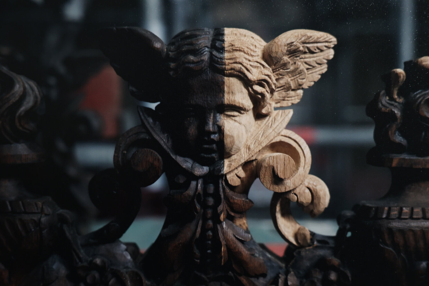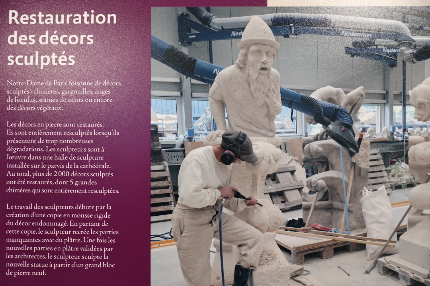 Μέσα από πλούσιο εποπτικό υλικό, παρουσιάζονται περίπου είκοσι εξειδικευμένα επαγγέλματα —λιθοξόοι, ξυλουργοί, υαλουργοί, γλύπτες, σιδεράδες, διακοσμητές και άλλοι τεχνίτες— που συνεργάστηκαν για την αναβίωση ενός από τα σημαντικότερα μνημεία της παγκόσμιας πολιτιστικής κληρονομιάς.