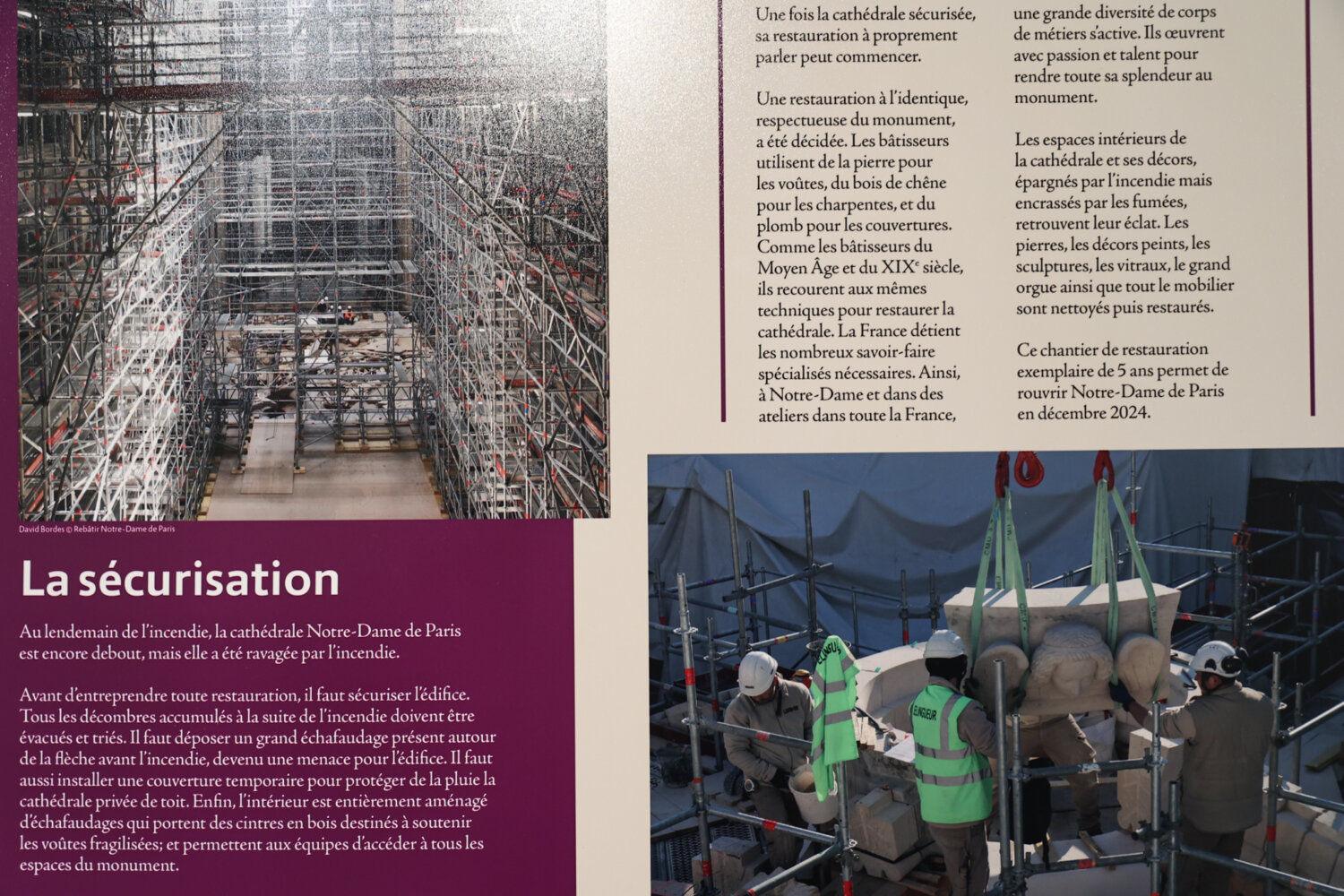 Η έκθεση έχει σχεδιαστεί από τον Δημόσιο Γαλλικό Οργανισμό Rebâtir Notre-Dame και παρουσιάζεται στη γαλλική γλώσσα με ελληνική μετάφραση, απευθυνόμενη τόσο σε φίλους της αρχιτεκτονικής όσο και σε κάθε επισκέπτη που επιθυμεί να γνωρίσει σε βάθος την ιστορία και την αξία του μνημείου.