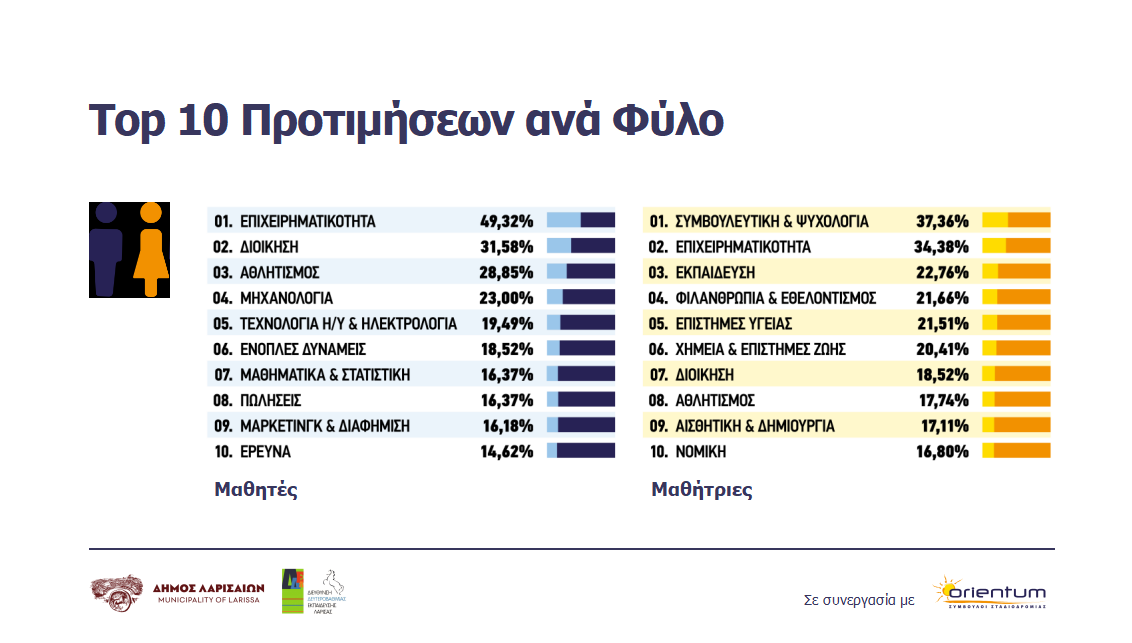 Επιχειρηματικότητα, Συμβουλευτική & Ψυχολογία, Διοίκηση, Αθλητισμός, Μάρκετινγκ και Διαφήμιση, συγκαταλέγονται στις κορυφαίες επαγγελματικές επιλογές των μαθητριών και μαθητών Λυκείου της Λάρισας. Στον αντίποδα, Κοινωνικές Επιστήμες, Τεχνικές Εργασίες, Θεολογία & Ποιμαντική, Οργάνωση Γραφείου, Φύση & Γεωργία κατατάσσονται στις τελευταίες θέσεις, σύμφωνα με τα πρώτα αποτελέσματα των τεστ Επαγγελματικών Δεξιοτήτων, που κλήθηκαν να συμπληρώσουν 2.000 μαθήτριες και μαθητές -μέσα από ένα ολοκληρωμένο και εξατομικευμένο πρόγραμμα επαγγελματικού προσανατολισμού, που προσφέρθηκε δωρεάν από τον Δήμο Λαρισαίων, σε μια ιδιαίτερα αξιόλογη πρωτοβουλία που ανταποκρίνεται στις ανάγκες της μαθητικής κοινότητας.