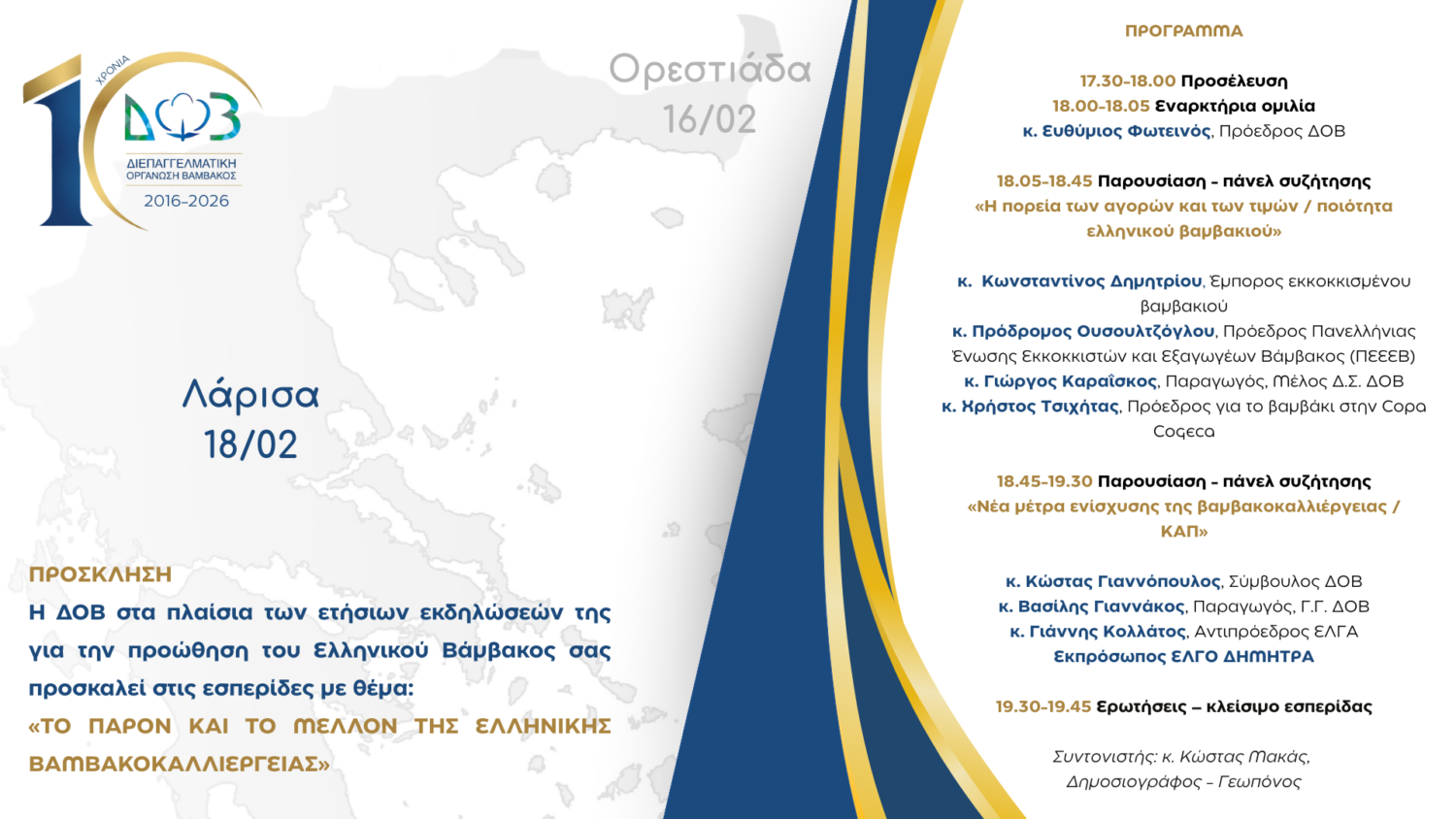 Η πρόσκληση και το πρόγραμμα της εσπερίδας είναι αναρτημένο στην ιστοσελίδα της Διεπαγγελματικής: https://hca.org.gr/esperida-dov-larissa-2026/.