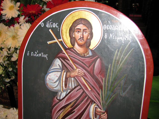 1. Τω Θεώ ώσπερ δώρον φερωνύμως, Θεόδωρε, δι’ αθλήσεως πόνων προσηνέχθης πολύτιμον, και άμωμον θύμα και δεκτή, παμμάκαρ, εγένου προσφορά• όθεν πόθω συνελθόντες, τους σους αγώνας εν ύμνοις γεραίρομεν