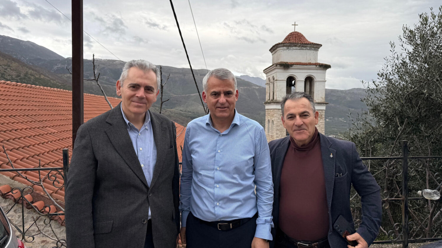 Ο Μάξιμος Χαρακόπουλος και ο Ηλίας Μυριάνθους με τον Βαγγέλη Ντούλε στη γενέτειρά του, το Καλογοραντζή: