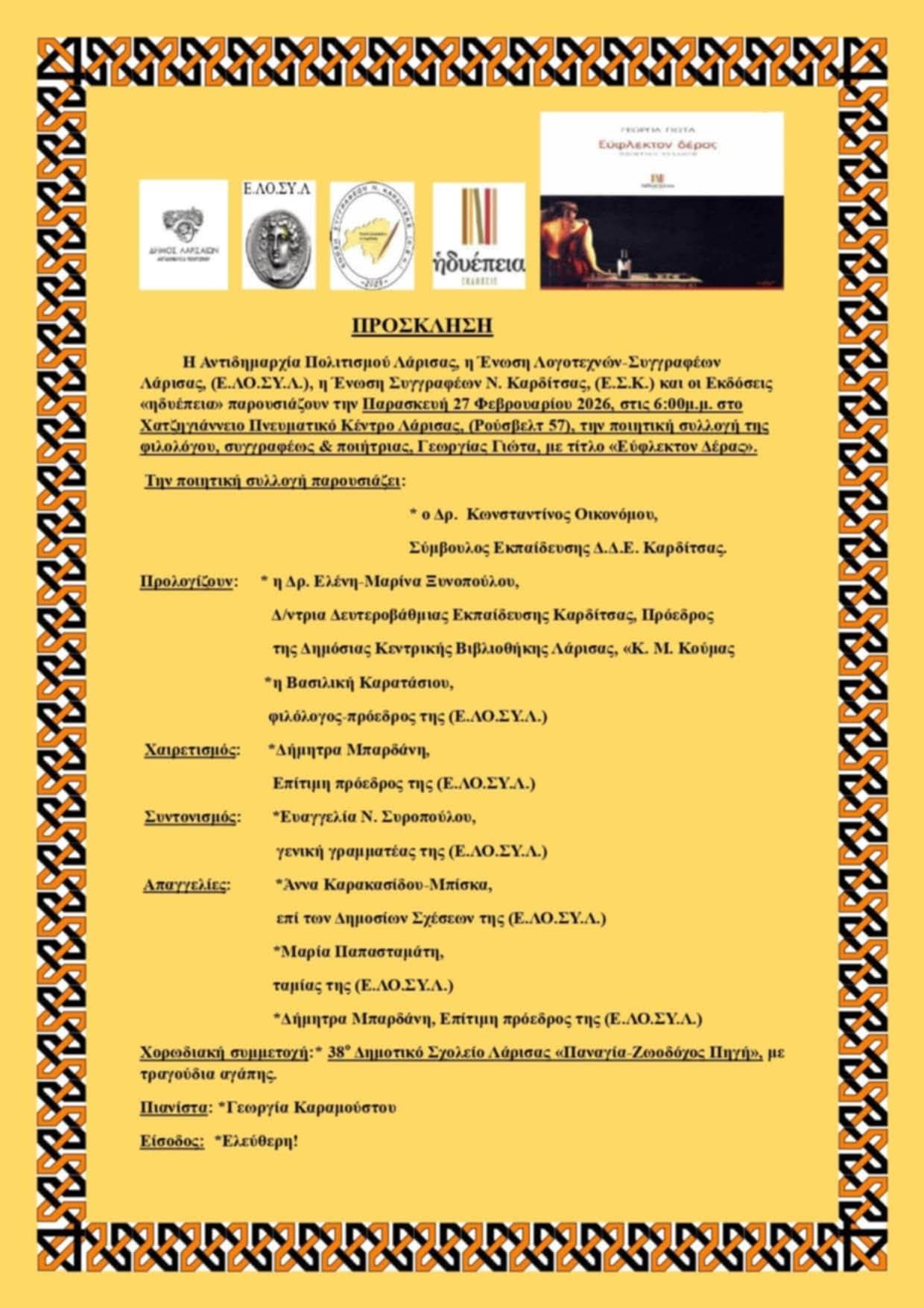 Την Παρασκευή 27 Φεβρουαρίου 2026 στις 6:00 μ.μ. στο Χατζηγιάννειο Πνευματικό κέντρο Λάρισας η Ένωση Λογοτεχνών – Συγγραφέων Λάρισας, (Ε.ΛΟ.ΣΥ.Λ.), παρουσιάζει την ποιητική συλλογή του μέλους της, φιλολόγου και ποιήτριας, Γεωργίας Γιώτα με τίτλο «Εύφλεκτον Δέρας».