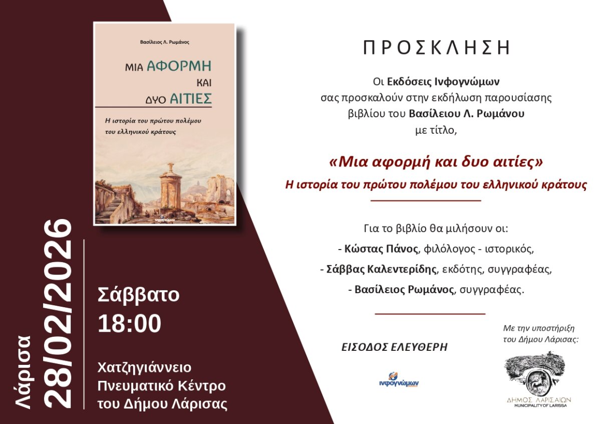 Οι Εκδόσεις Ινφογνώμων διοργανώνουν εκδήλωση παρουσίασης του νέου βιβλίου του Βασίλειος Λ. Ρωμάνος με τίτλο «Μια αφορμή και δυο αιτίες – Η ιστορία του πρώτου πολέμου του ελληνικού κράτους».