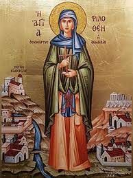 Η ΑΡΧΟΝΤΙΣΣΑ ΜΟΝΑΧΗ: Η Φιλοθέη ήταν κόρη του Αθηναίου λογίου Αγγέλου Μπενιζέλου. Γεννήθηκε στην Αθήνα το 1522 και το βαπτιστικό της όνομα ήταν Ρηγούλα. Μετά από επιμονή των γονέων της νυμφεύτηκε ένα αρχοντόπουλο της αθηναϊκής οικογένειας των Χειλάδων (1536). Όμως ο σύζυγός της πέθανε τρία έτη αργότερα. Έτσι η Αγία, χωρίς οικογενειακά βάρη, επιδόθηκε σε πλήρη αγαθοεργιών ασκητκό βίο. Όταν μάλιστα πέθαναν και οι γονείς της, η Ρηγούλα μετέτρεψε ένα γειτονικό της ναϊσκο (Α. Ανδρέα) σε Μοναστήρι στο οποίο κληροδότησε το μεγαλύτερο τμήμα της περιουσίας της. Η ίδια εκάρη μοναχή παίρνοντας το όνομα Φιλοθέη. Εν συνεχεία εισήλθε πρώτη στη μονή, ως ηγουμένη, ακολουθούμενη από υπηρέτριές της.