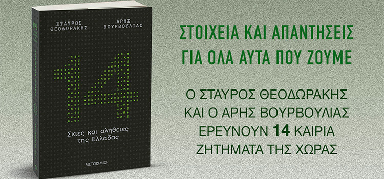 Ο δημοσιογράφος Σταύρος Θεοδωράκης, γνωστός στο ευρύ κοινό από την τηλεοπτική εκπομπή «Πρωταγωνιστές», και ο Άρης Βουρβούλιας, δημιουργός της σειράς podcast «Do it Like» και συνδημιουργός του πολιτικού ντοκιμαντέρ για τη Χρυσή Αυγή «Χρυσοί Φρουροί», ενώνουν τις δυνάμεις τους στο νέο τους βιβλίο 14 σκιές και αλήθειες της Ελλάδας.