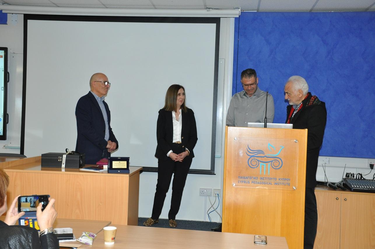 Η Διευθύντρια Πρωτοβάθμιας Εκπαίδευσης Λάρισας, κ. Καραγιώργου Αικατερίνη, ευχαρίστησε θερμά τη Διευθύντρια και το επιστημονικό προσωπικό του Παιδαγωγικού Ινστιτούτου Κύπρου, απονέμοντας αναμνηστική πλακέτα για τη συνεργασία στη διοργάνωση του ιδιαίτερα σημαντικού επιμορφωτικού σεμιναρίου υψηλού επιστημονικού κύρους και επιστημονικής τεκμηρίωσης, μέσω του οποίου οι Ελλαδίτες/ισσες εκπαιδευτικοί αποκόμισαν πολύτιμες, ουσιαστικές και αξιοποιήσιμες γνώσεις για την ενίσχυση του παιδαγωγικού και διδακτικού τους έργου.