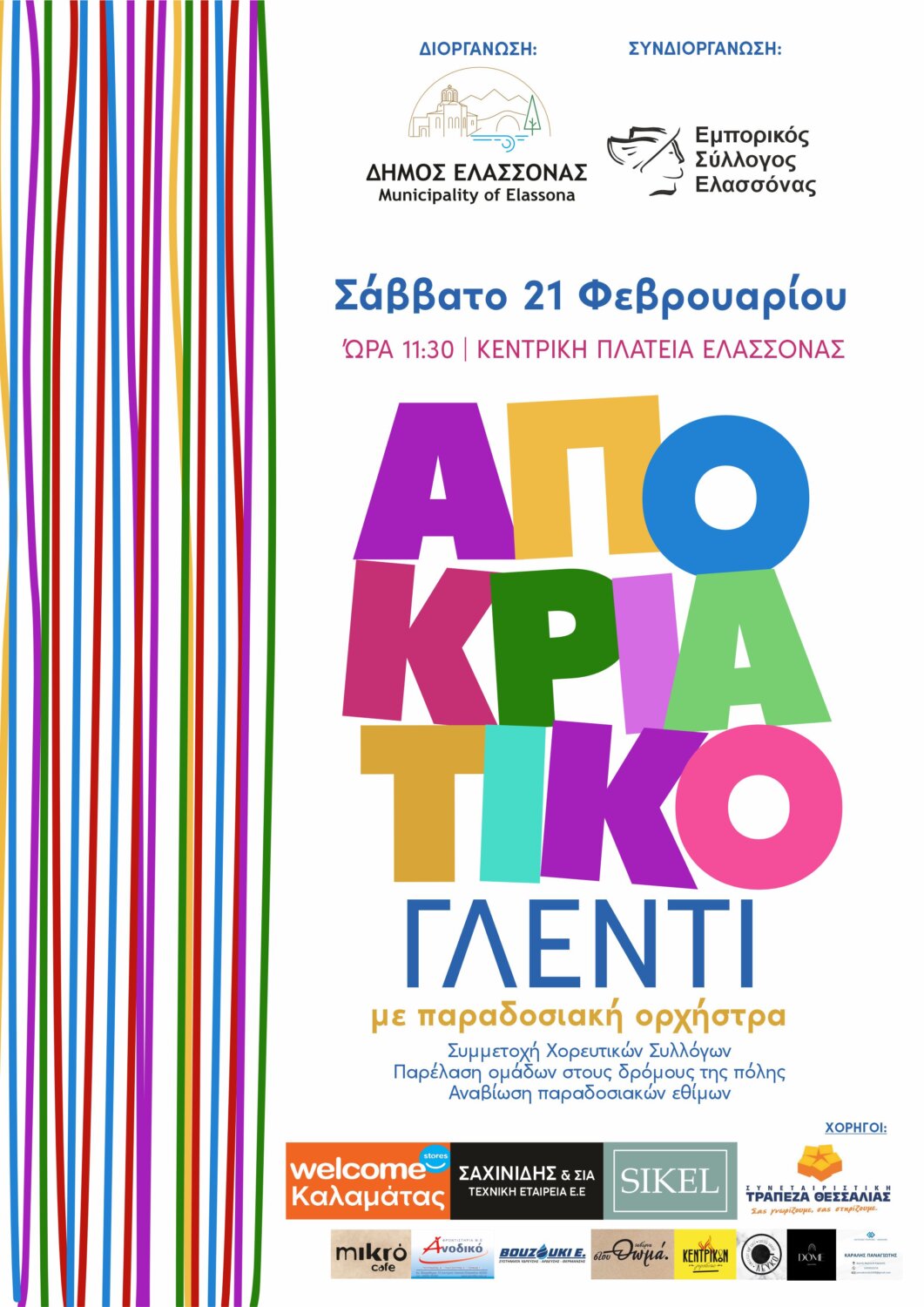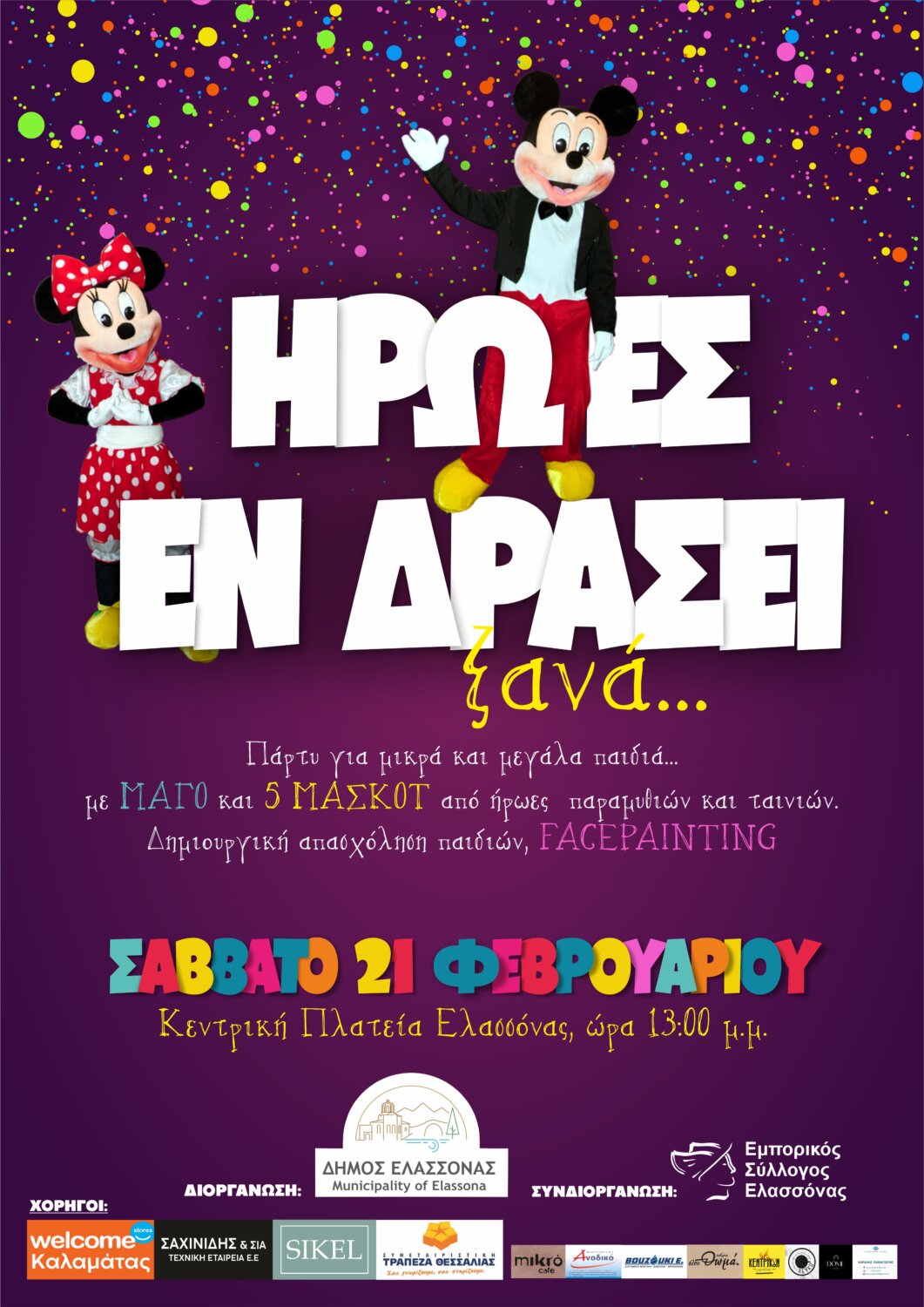 Το πρωινό του Σαββάτου 21 Φεβρουαρίου η Κεντρική Πλατεία Ελασσόνας, ζωντανεύει με δύο μοναδικές εκδηλώσεις για μικρούς και μεγάλους, στο πλαίσιο των καρναβαλικών εκδηλώσεων του Δήμου Ελασσόνας.