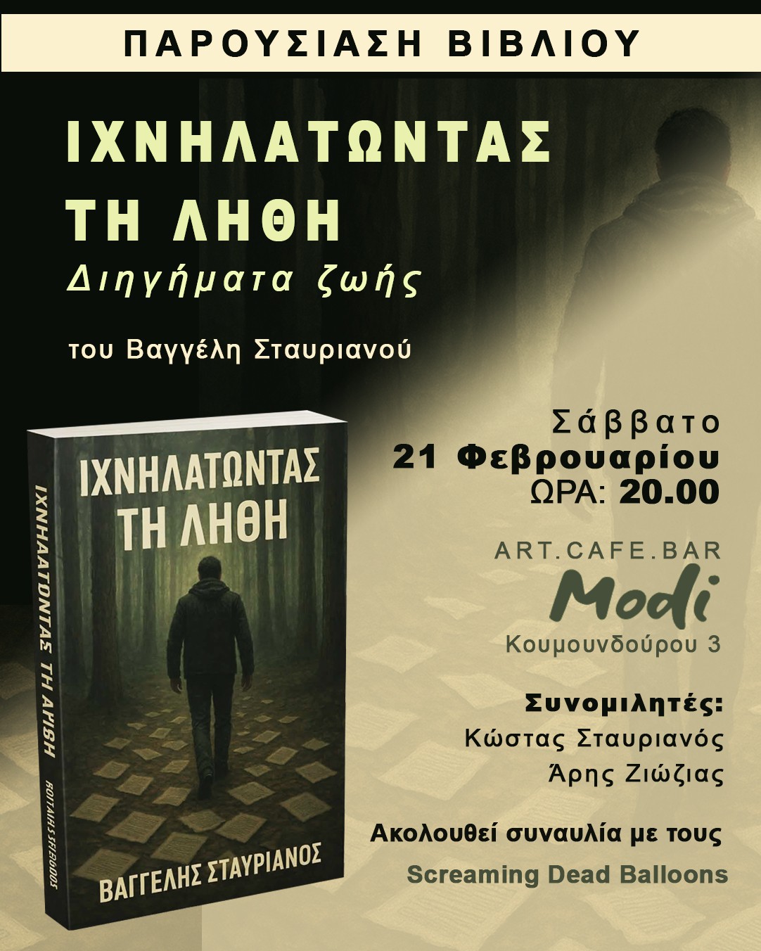 Η παρουσίαση του βιβλίου θα γίνει το Σάββατο 21 Φεβρουαρίου 2026 και ώρα 20:00, στο Modi art café bar, με συνομιλητές τον Κώστα Σταυριανό και τον Άρη Ζιώζια. Θα ακολουθήσει συναυλία με τους Screaming Dead Balloons.