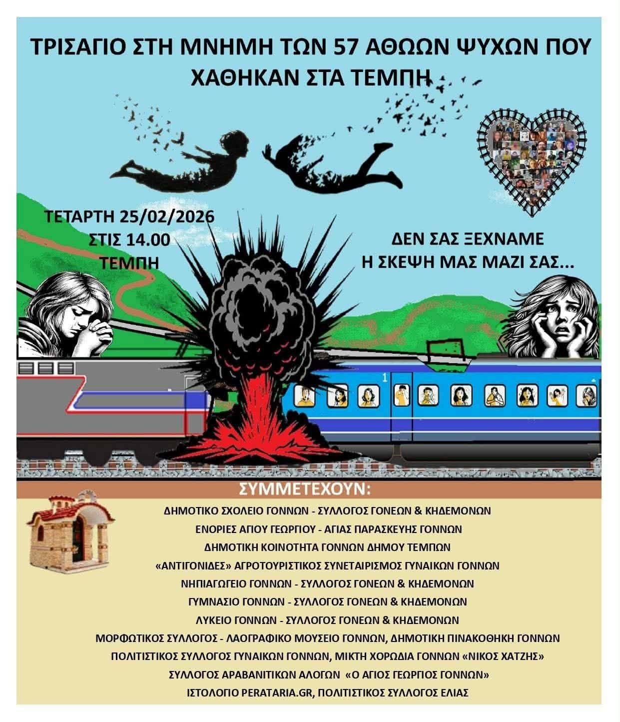 «Με βαθιά συγκίνηση και σεβασμό, σας προσκαλούμε να παρευρεθείτε στο Τρισάγιο που θα τελεστεί στη μνήμη των 57 αθώων ψυχών που χάθηκαν στα Τέμπη.