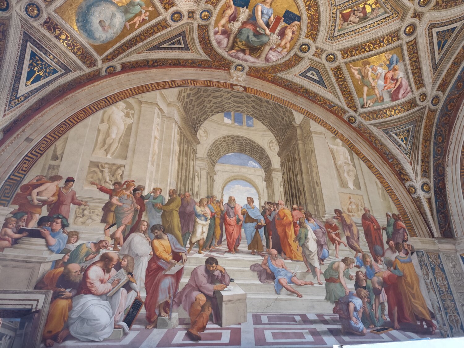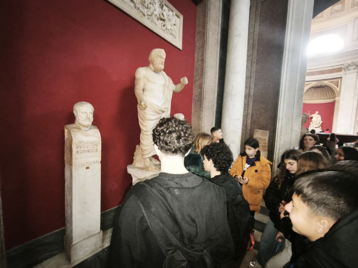 Η πρώτη μέρα του ταξιδιού μας ήταν αφιερωμένη στο Βατικανό με τα τρία μουσεία, την Καπέλα Σιστίνα, τη Βασιλική και την πλατεία του Αγίου Πέτρου. Σημαντικοί σταθμοί της ξενάγησής μας: Η Πινακοθήκη, το Μουσείο Κιαραμόντι, οι διάδρομοι των ταπισερί και των γεωγραφικών χαρτών, τα δωμάτια του Ραφαήλ. Στην Καπέλα Σιστίνα υψώσαμε ψηλά το βλέμμα μας , για να θαυμάσουμε τις νωπογραφίες του Μιχαήλ Άγγελου στην οροφή. Στην αίθουσα της υπογραφής σταθήκαμε αρκετή ώρα μπροστά στη «Σχολή των Αθηνών», την περίφημη νωπογραφία του Ραφαήλ, σχολιάζοντας τα πρόσωπα και ερμηνεύοντας τους συμβολισμούς. Στη Βασιλική του Αγίου Πέτρου θαυμάσαμε την εκθαμβωτική “Pieta” του Μιχαήλ Άγγελου, τον εντυπωσιακό τρούλο και το κιβώριο του Μπερνίνι.
