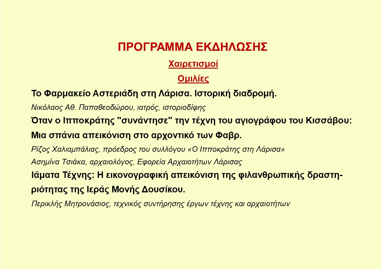 Όταν ο Ιπποκράτης συνάντησε την τέχνη του αγιογράφου του Κισσάβου: Μια σπάνια απεικόνιση στο αρχοντικό των Φαβρ/ Ρίζος Χαλιαμπάλιας, πρόεδρος του συλλόγου «Ο Ιπποκράτης στη Λάρισα», Ασημίνα Τσιάκα, αρχαιολόγος, Εφορεία Αρχαιοτήτων Λάρισας