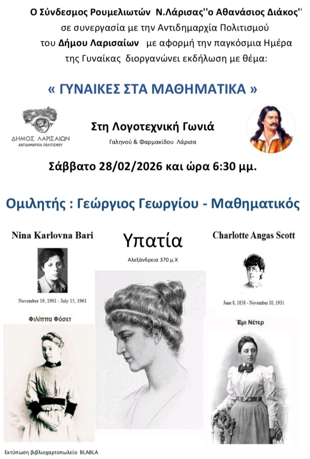 Εκδήλωση με θέμα «Γυναίκες στα Μαθηματικά» , διοργανώνει, με αφορμή την Ημέρα της Γυναίκας, ο Σύνδεσμος Ρουμελιωτών Ν. Λάρισας «Ο Αθανάσιος Διάκος» σε συνεργασία με την Αντιδημαρχία Πολιτισμού του Δήμου Λαρισαίων.