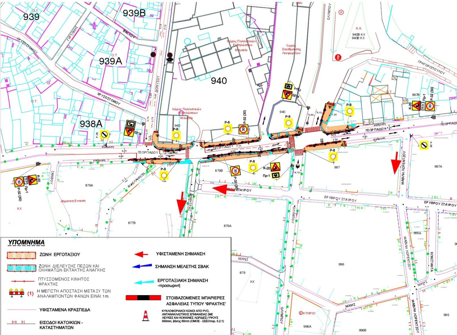 Κατά τη διάρκεια των εργασιών στην οδό ΓΕΩΡΓΙΑΔΟΥ, η κυκλοφορία των οχημάτων θα διεξάγεται σύμφωνα με τις προβλεπόμενες πληροφοριακές και ρυθμιστικές πινακίδες που θα τοποθετηθούν από τον ανάδοχο του έργου.