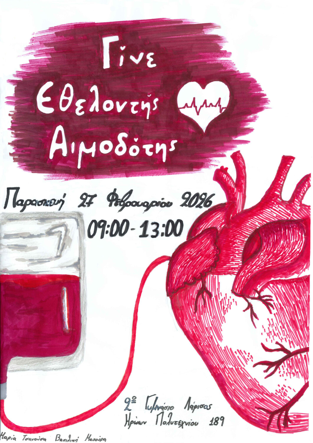 Με κεντρικό σύνθημα την προσφορά και την αλληλεγγύη, ο Σύλλογος Εθελοντών Αιμοδοτών του 2ου Γυμνασίου Λάρισας, σε μια ξεχωριστή συνεργασία με το 2ο Γενικό Λύκειο Λάρισας, το Πρότυπο Γυμνάσιο Λάρισας και το Πρότυπο Λύκειο Λάρισας, απευθύνει ανοιχτό κάλεσμα για συμμετοχή στην κοινή τους εθελοντική δράση. Η εκδήλωση πραγματοποιείται με την πολύτιμη συμβολή του Τμήματος Αιμοδοσίας του Γενικού Νοσοκομείου Λάρισας την Παρασκευή, 27 Φεβρουαρίου 2026, από τις 09:00 π.μ. έως τις 13:00, στον ειδικά διαμορφωμένο χώρο του ισογείου του 2ου Γυμνασίου Λάρισας (Ηρώων Πολυτεχνείου 189).
