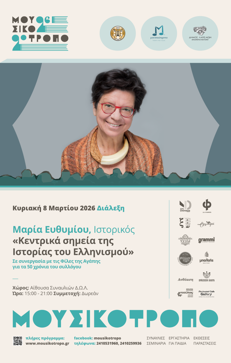 Μία εκτενή ιστορική διάλεξη με τίτλο «Κεντρικά σημεία της Ιστορίας του Ελληνισμού», ενταγμένη στη θεματική «Από την Ιστορία στην Τέχνη: “Αυτός ο κόσμος ο μικρός, ο μέγας”», πρόκειται να παρουσιάσει η καθηγήτρια Ιστορίας κ. Μαρία Ευθυμίου, την Κυριακή 8 Μαρτίου 2026, στην Αίθουσα Συναυλιών του Δημοτικού Ωδείου Λάρισας, στο πλαίσιο του Φεστιβάλ Μουσικότροπο 2026. Η διάλεξη θα ξεκινήσει στις 15:00 και θα ολοκληρωθεί στις 21:00. Η είσοδος είναι ελεύθερη για το κοινό, ενώ δελτία εισόδου θα διανέμονται από την Τρίτη 3 Μαρτίου στο Δημοτικό Ωδείο Λάρισας έως και το Σάββατο 7 Μαρτίου και ώρες: Καθημερινές: 10:00-13:00, Σάββατο: 11:00-14:00.