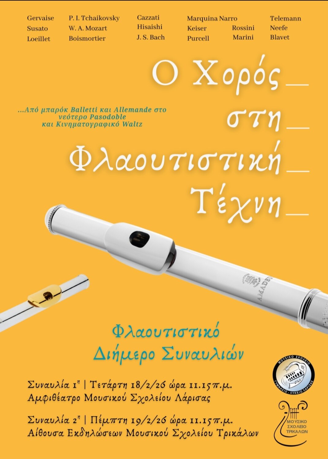 Με επιτυχία ολοκληρώθηκε το διήμερο συναυλιών που πραγματοποιήθηκε στις 18 και 19 Φεβρουαρίου 2026, στο πλαίσιο κοινού πολιτιστικού προγράμματος «Ο Χορός στη Φλαουτιστική Τέχνη», μια πρωτοβουλία συνεργασίας ανάμεσα στο Μουσικό Σχολείο Λάρισας και το Μουσικό Σχολείο Τρικάλων, με τη συμμετοχή 6 εκπαιδευτικών μουσικής και 43 μαθητών της τάξης φλάουτου των δύο σχολείων.