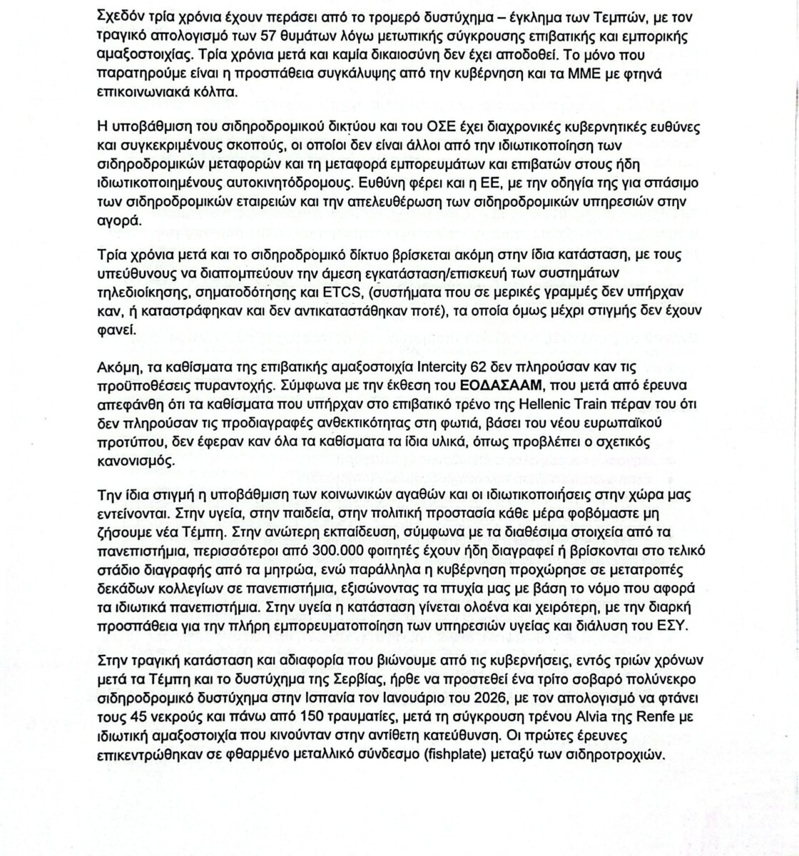Στην αυριανή απεργιακή συγκέντρωση για τα Τέμπη, θα συμμετέχει ο Σύλλογος Φοιτητών Ιατρικής Λάρισας.